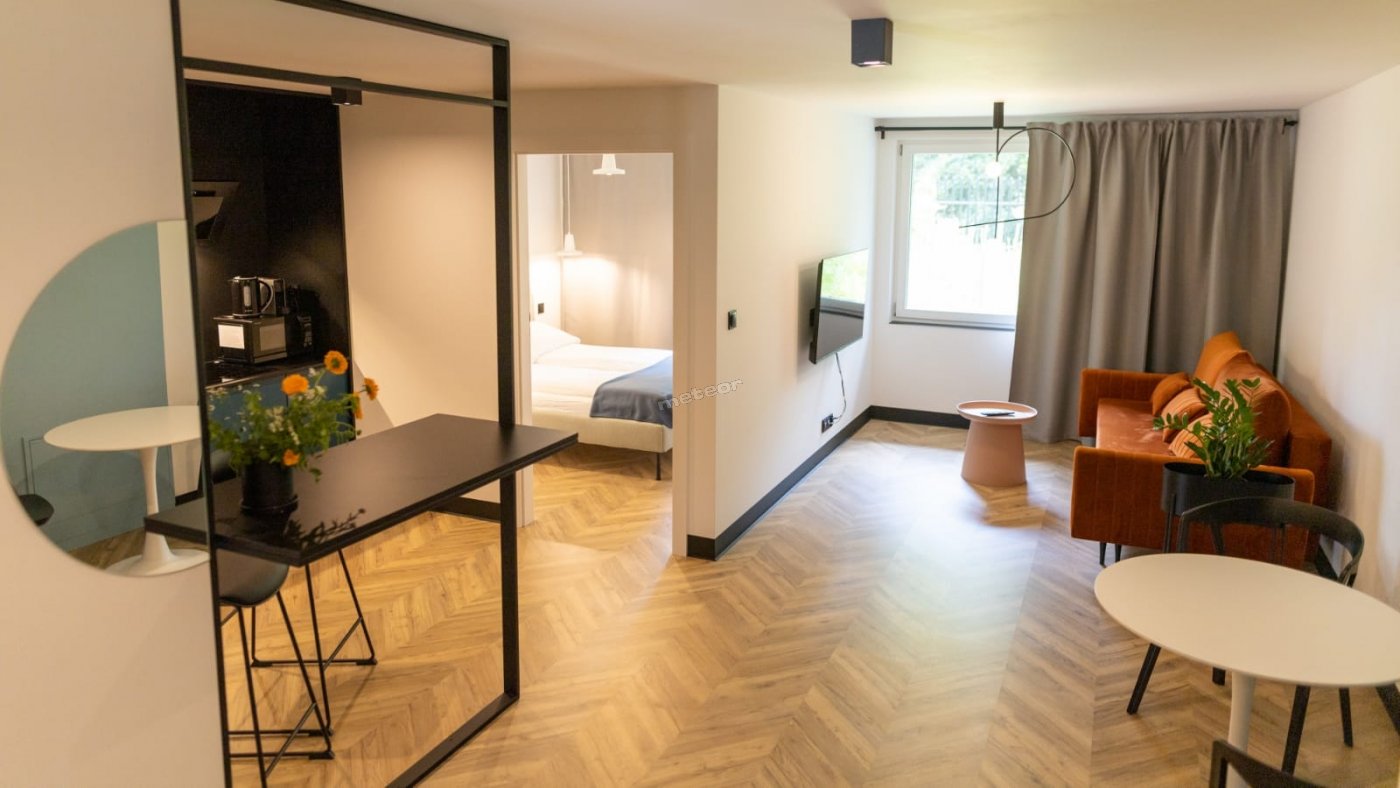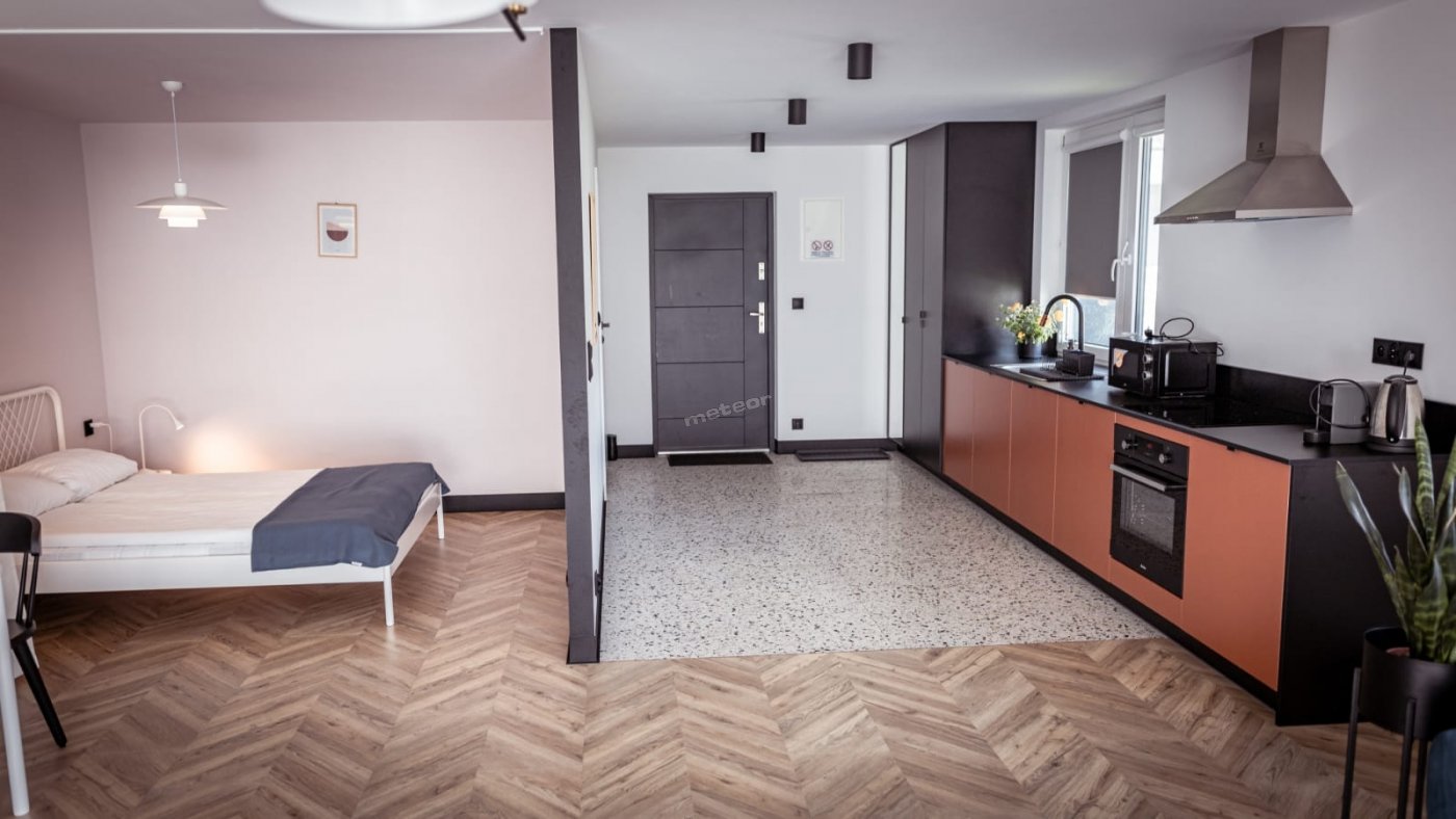 Komfortowe apartamenty z łazienkami, aneksami kuchennymi i tarasami.