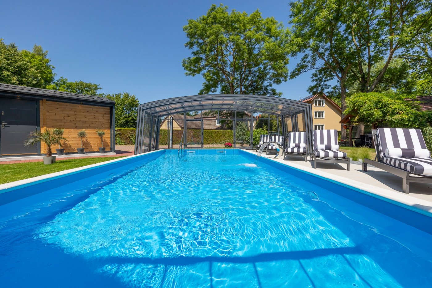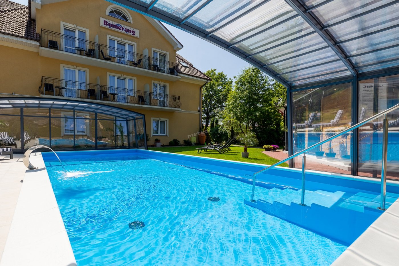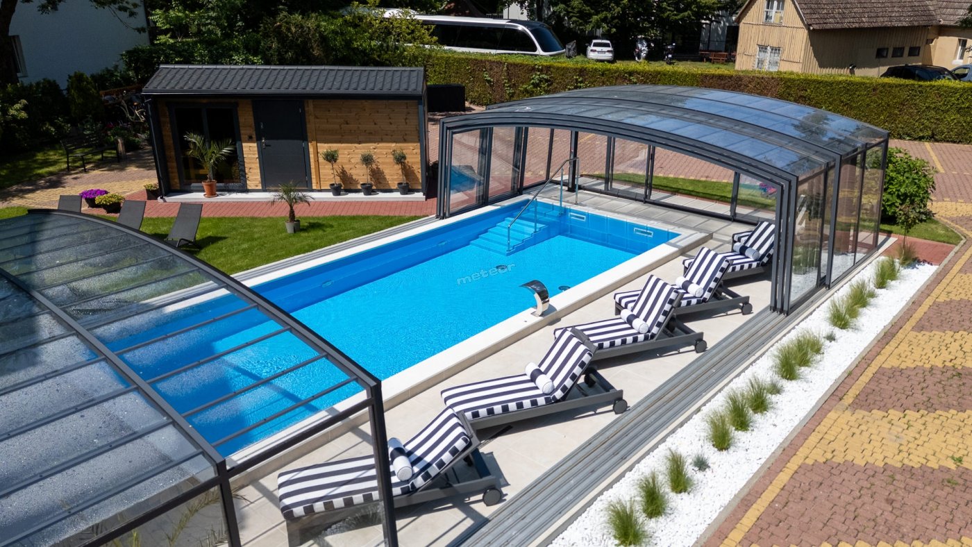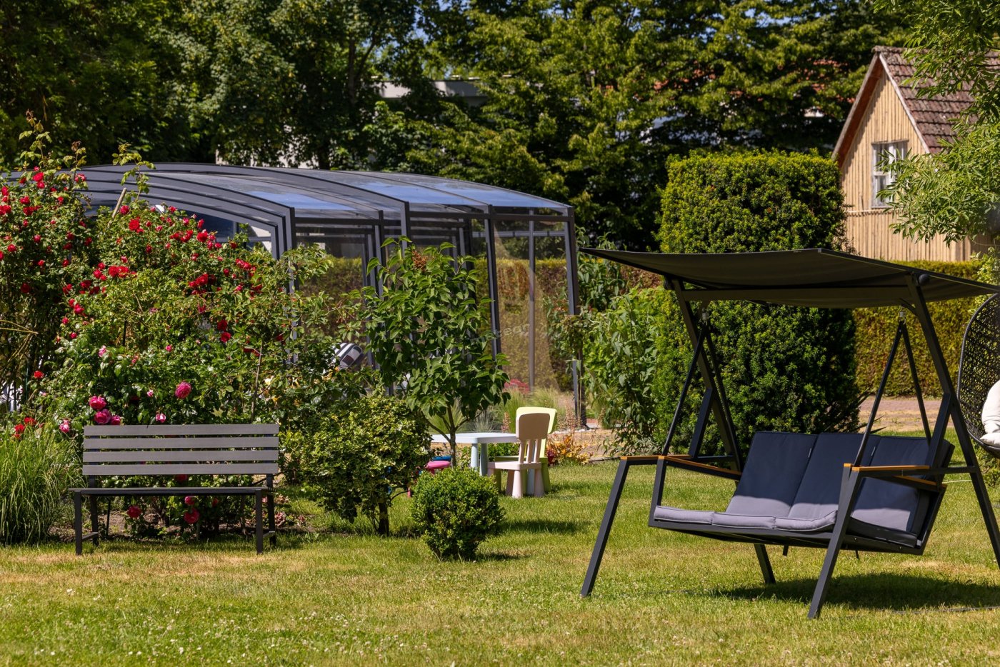 Nasz duży ogród stanowi idealne miejsce do relaksu i zabawy. Nowością na sezon 2025 jest basen kryty, z ruchomym zadaszeniem oraz sauna. Dla dzieci przygotowaliśmy plac zabaw, trampoliny.