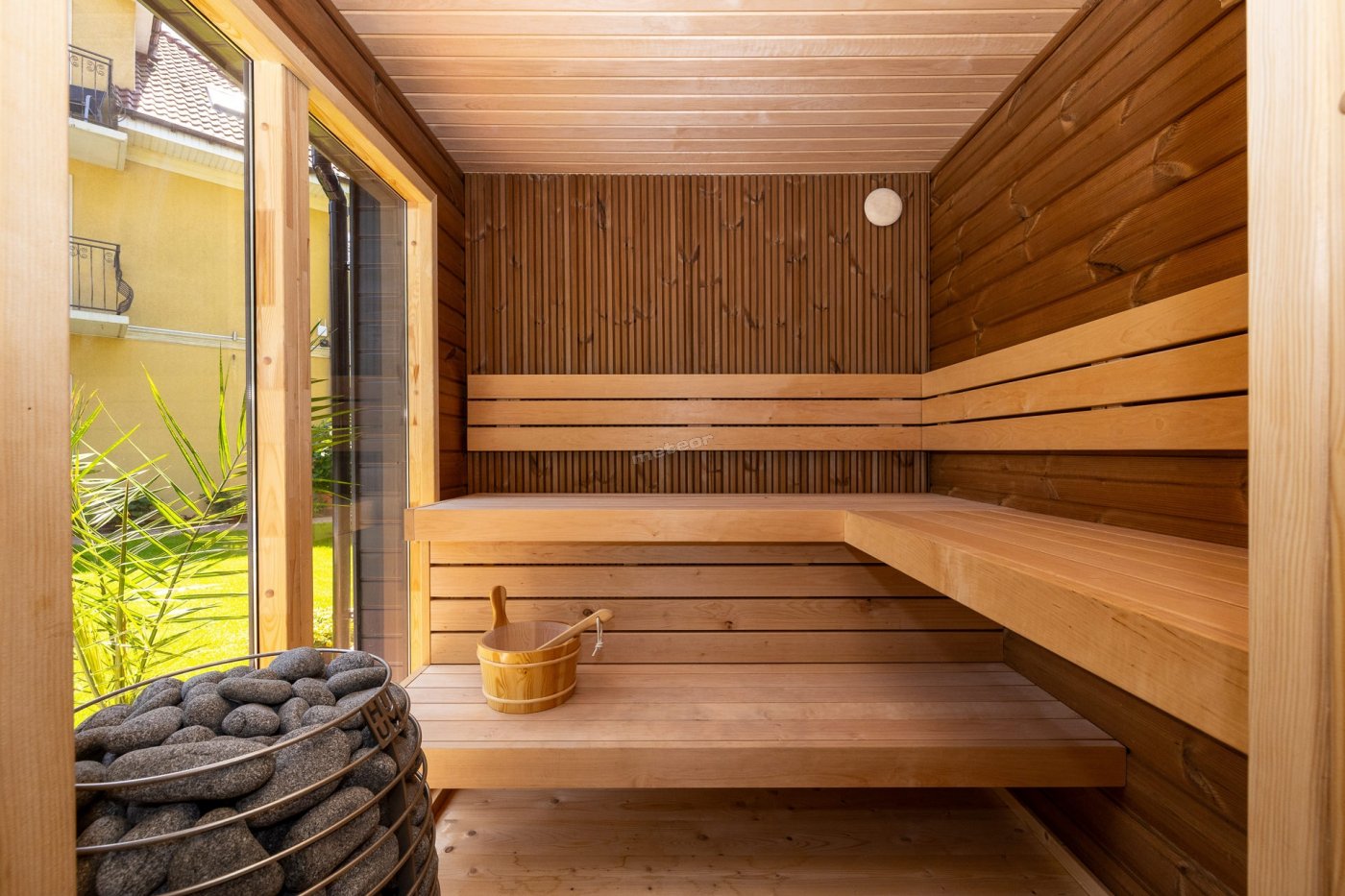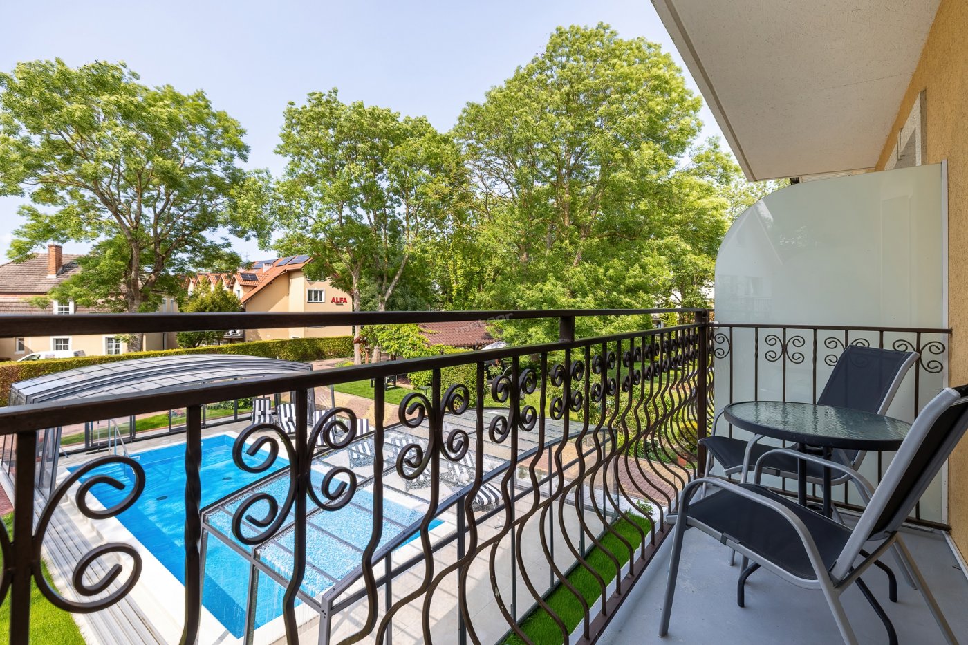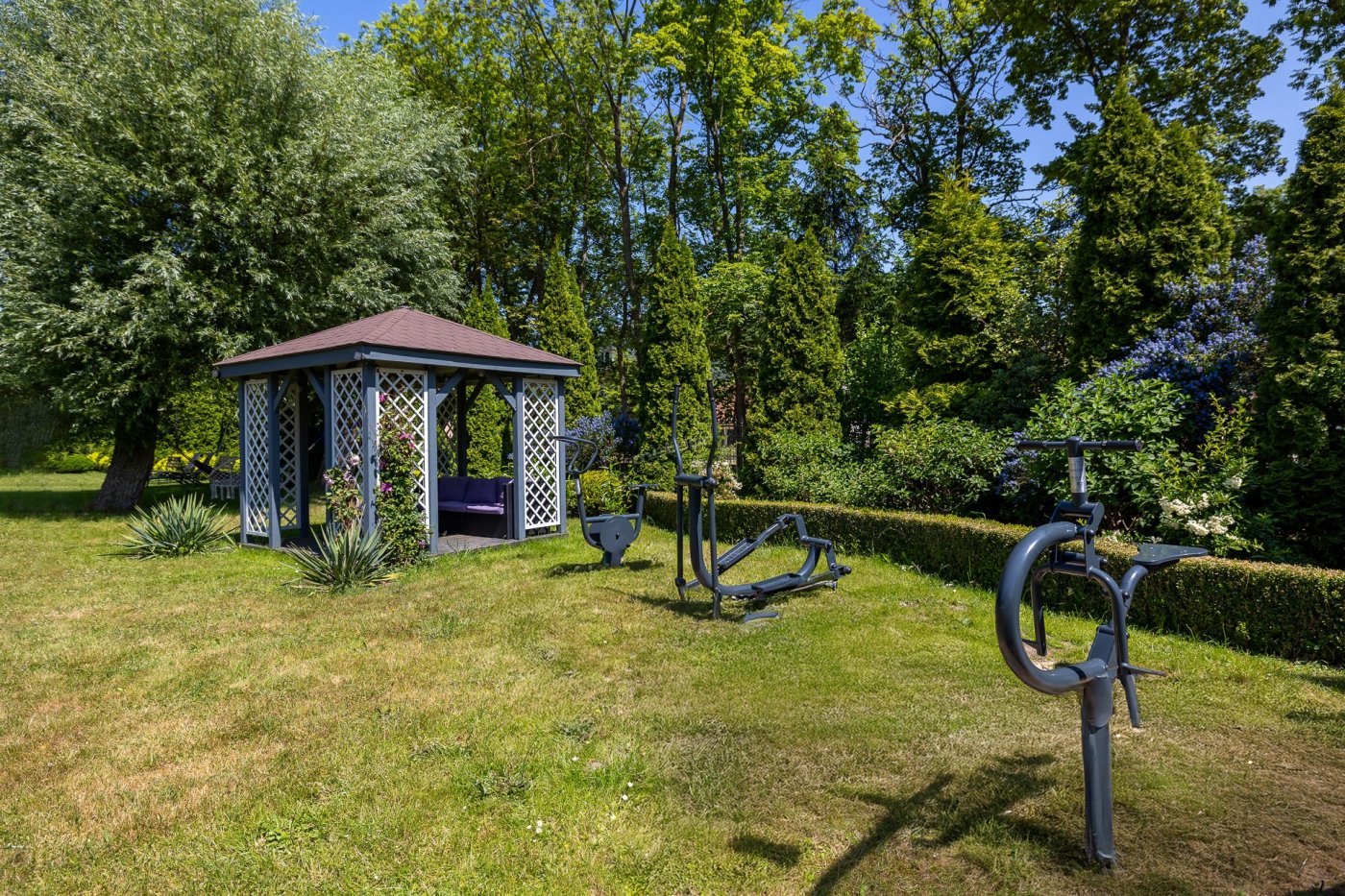 Nasz duży ogród stanowi idealne miejsce do relaksu i zabawy. Nowością na sezon 2025 jest basen kryty, z ruchomym zadaszeniem oraz sauna. Dla dzieci przygotowaliśmy plac zabaw, trampoliny.