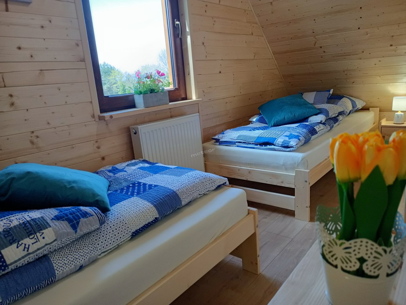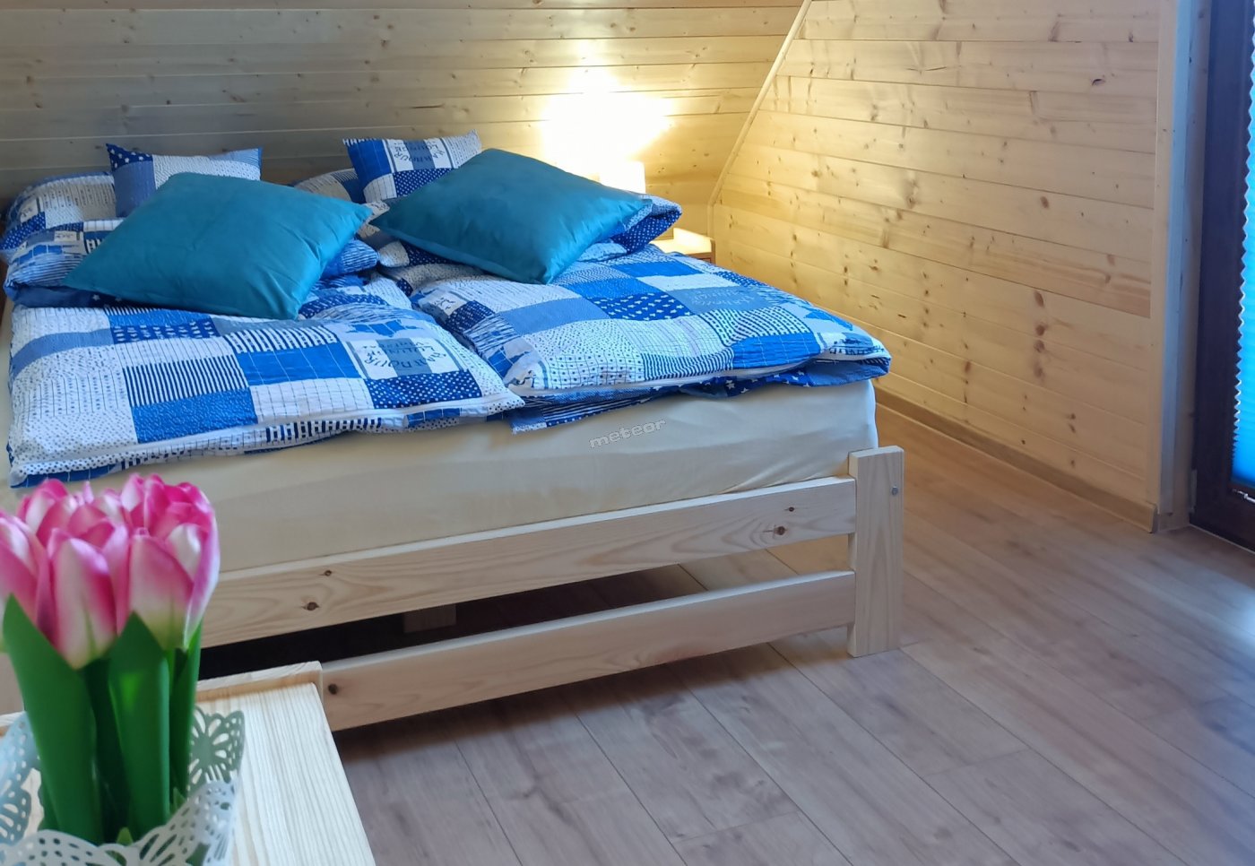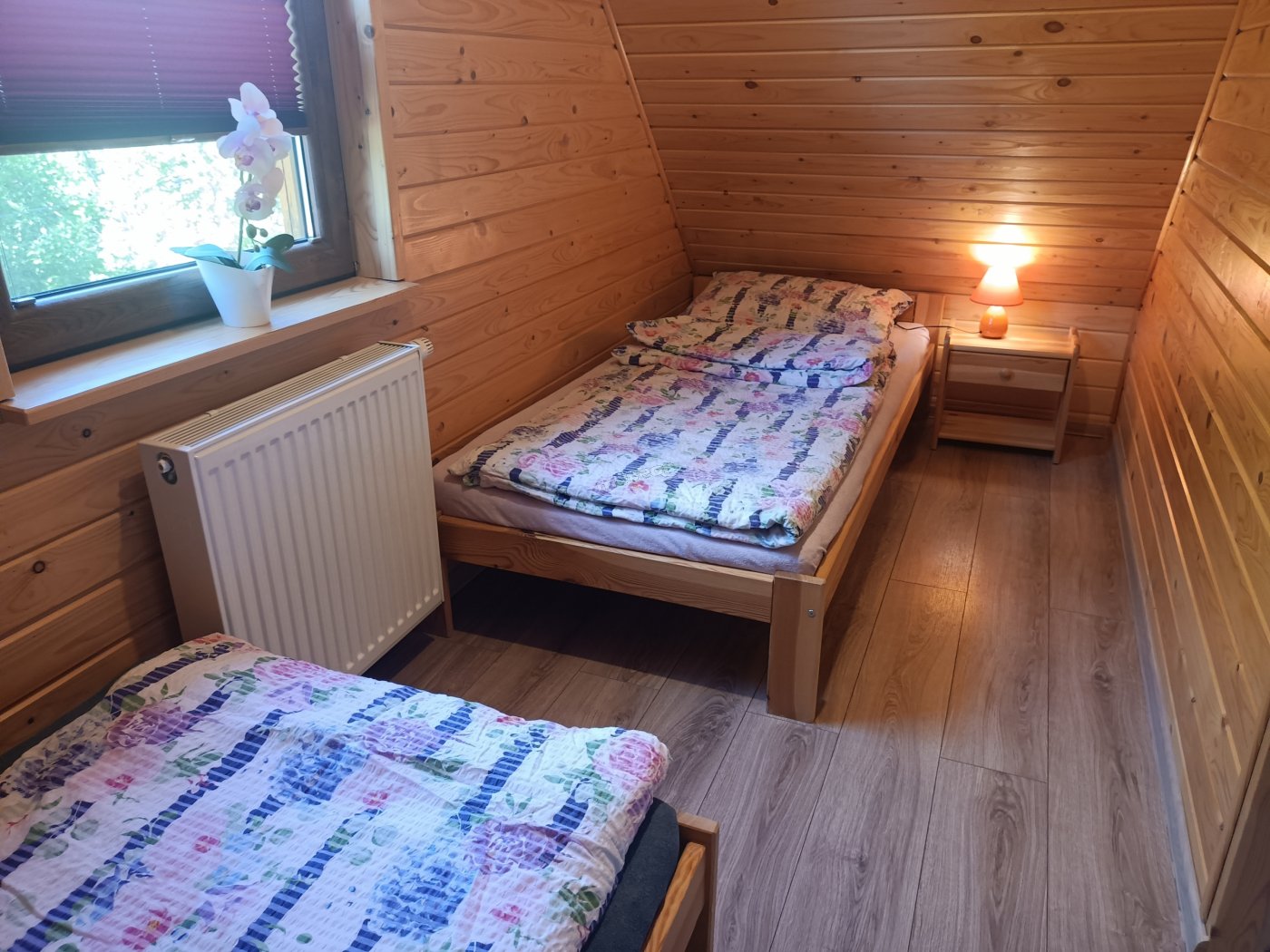 Do Państwa dyspozycji jest salon z kominkiem i w pełni wyposażonym aneksem kuchennym oraz dwie sypialnie na poddaszu. Jeden z pokoi posiada jedno dwuosobowe łóżko i wyjście na balkon, drugi zaś dwa łóżka pojedyncze. W domku znajduje się nowocześnie wykończona łazienka.