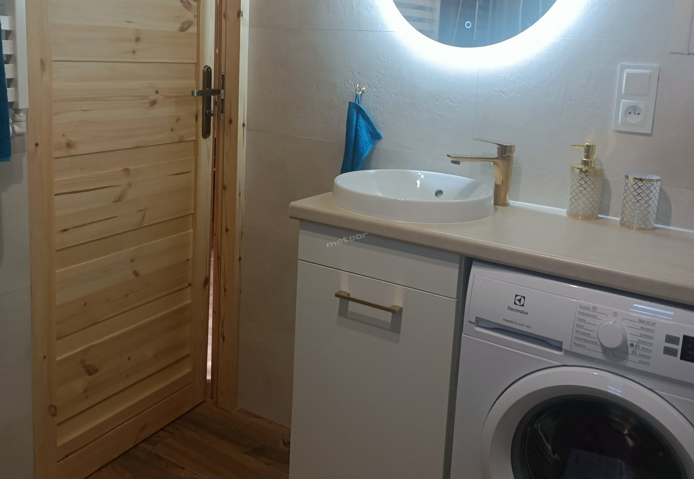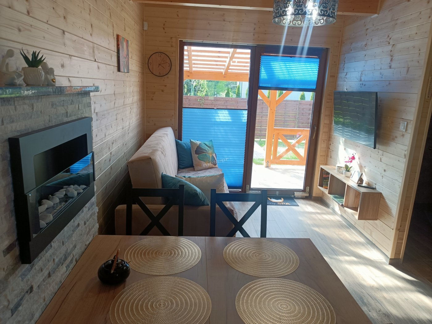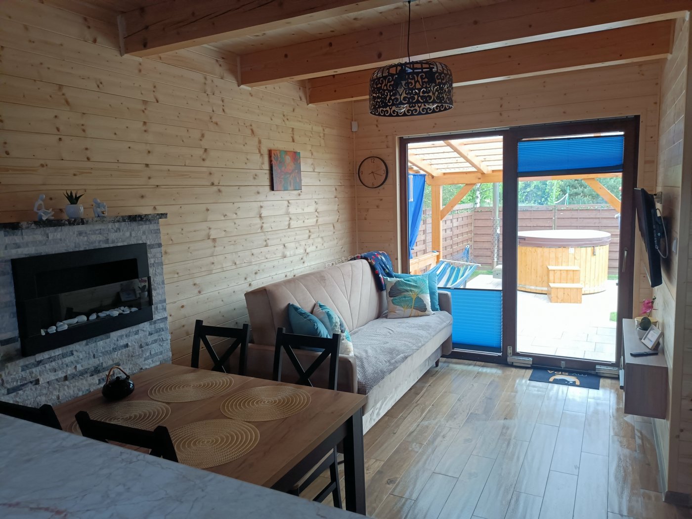 Do Państwa dyspozycji jest salon z kominkiem i w pełni wyposażonym aneksem kuchennym oraz dwie sypialnie na poddaszu. Jeden z pokoi posiada jedno dwuosobowe łóżko i wyjście na balkon, drugi zaś dwa łóżka pojedyncze. W domku znajduje się nowocześnie wykończona łazienka.