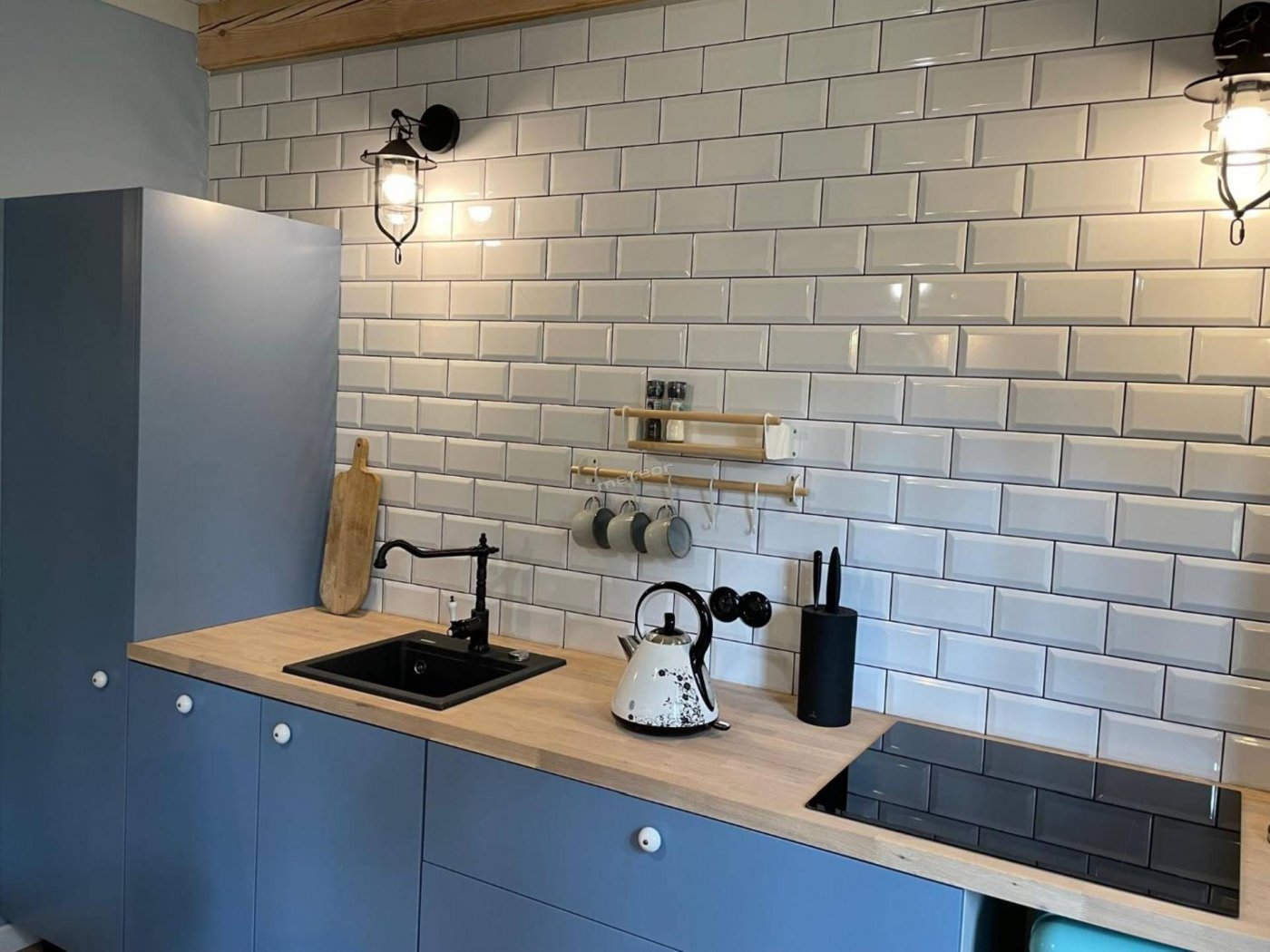Wyposażenie aneksu kuchennego: lodówka, czajnik elektryczny, płyta indukcyjna, naczynia.