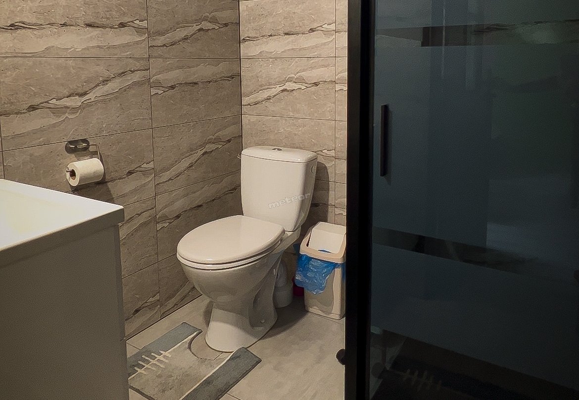 Ausstattung des Badezimmers: Dusche, Waschbecken, Toilette.