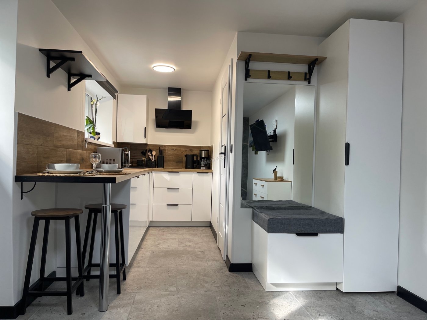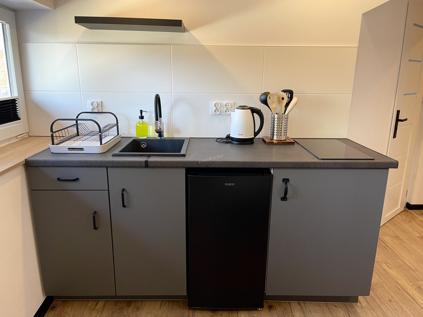 Den Gästen steht die voll ausgestattete Küche/Esszimmer mit Wasserkocher, Kühlschrank, Mikrowelle, Induktionskochfeld, Toaster, Geschirr und Besteck zur Verfügung.