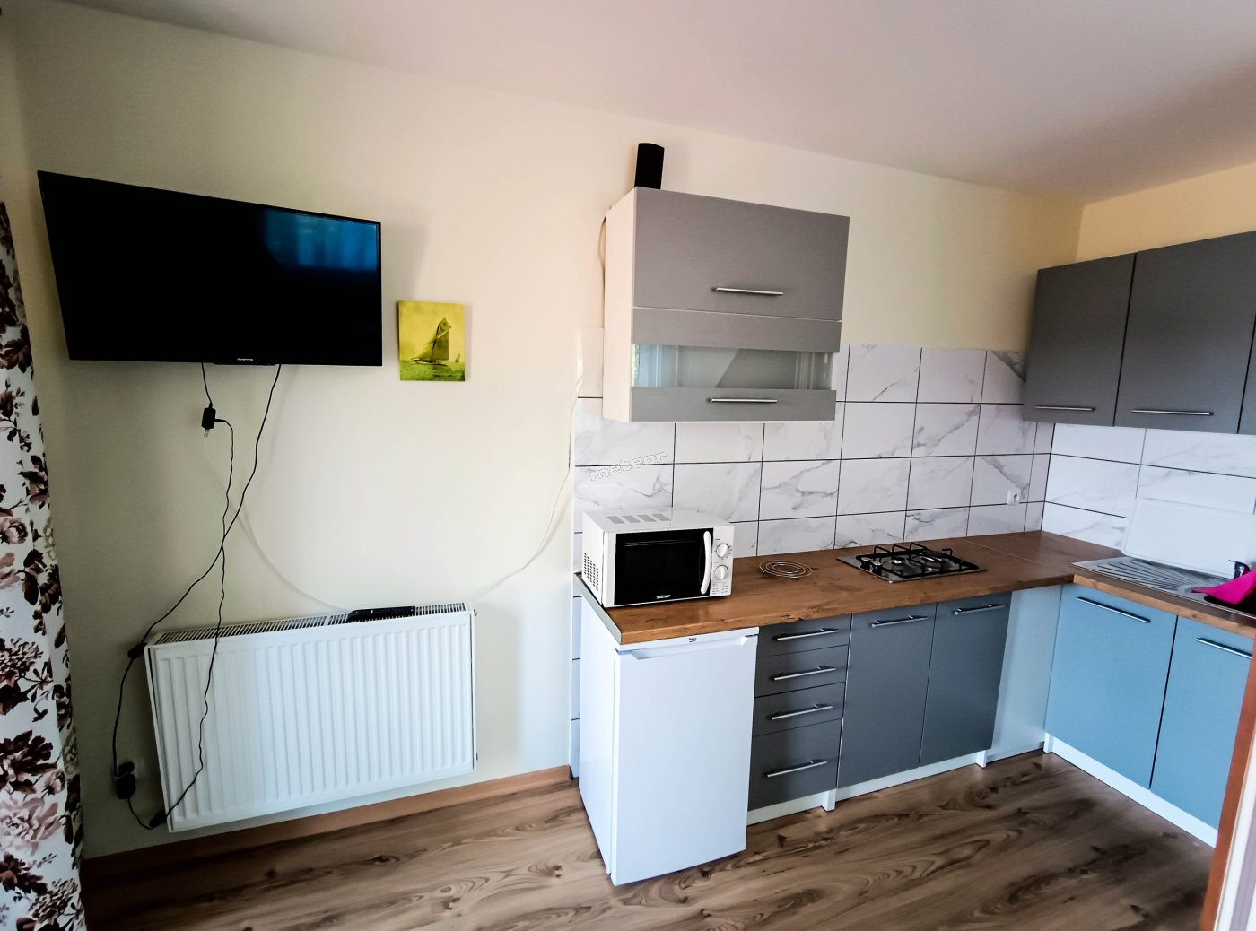Ausstattung der Kochnische: Kühlschrank, Küchengeschirr, Besteck.