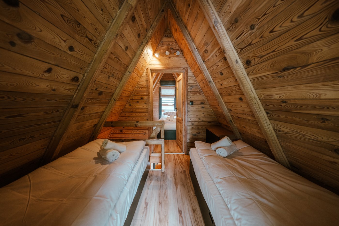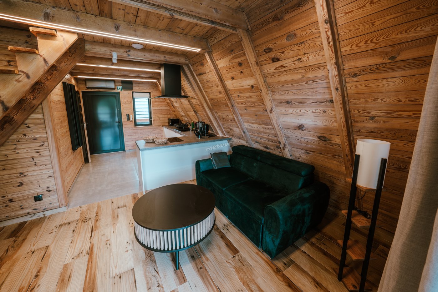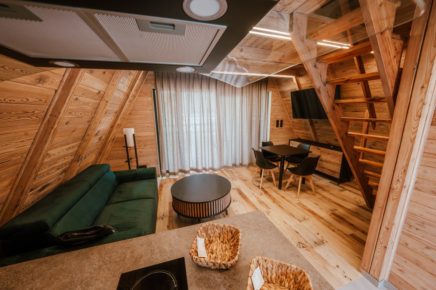 Bungalows für 4, 6 Personen, mit Badezimmern und Kochnischen.