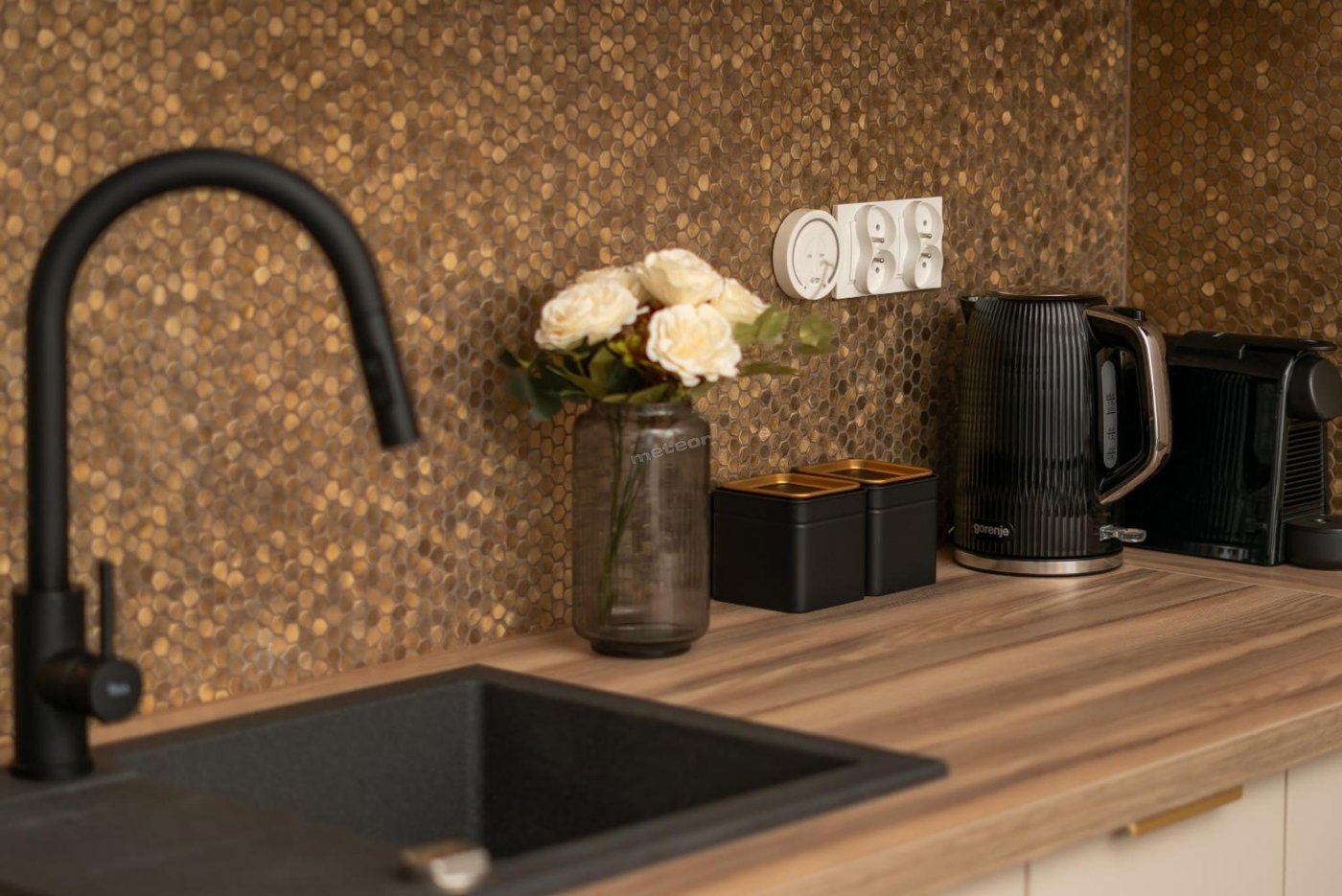 In der Küchenzeile: Kühlschrank, Küchenutensilien, Wasserkocher, Backofen, Herdplatte, Mikrowelle, Geschirrspüler, Kaffeemaschine.