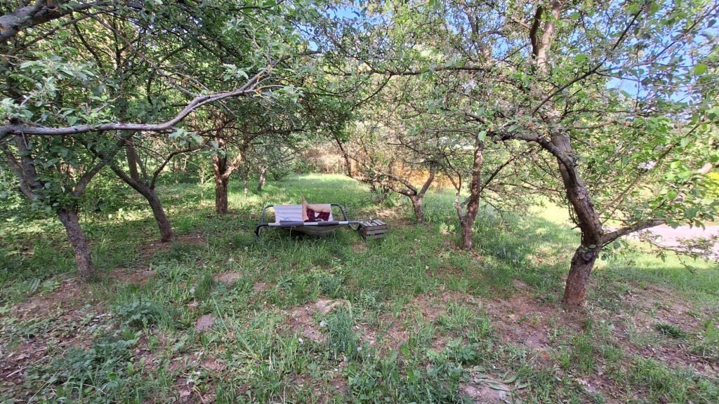 Auf dem Gelände: Pavillon, Apfelgarten, Parkplatz.