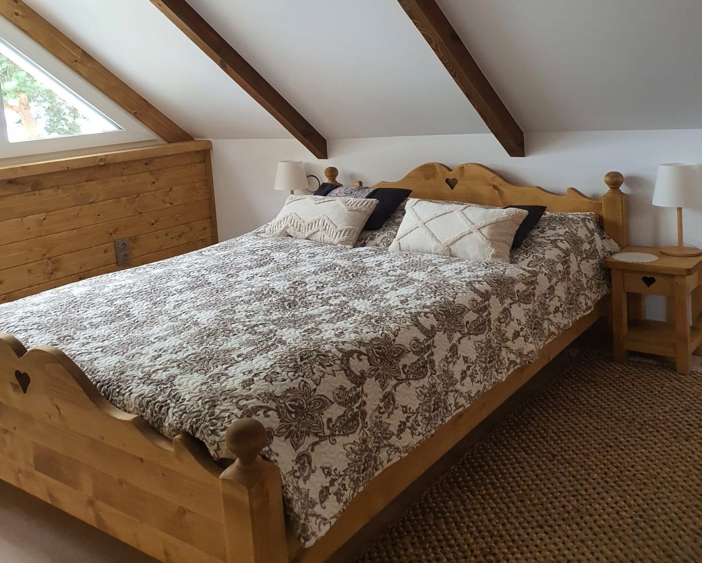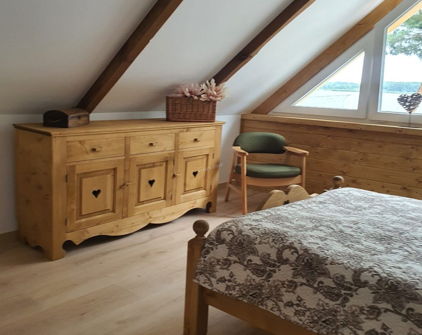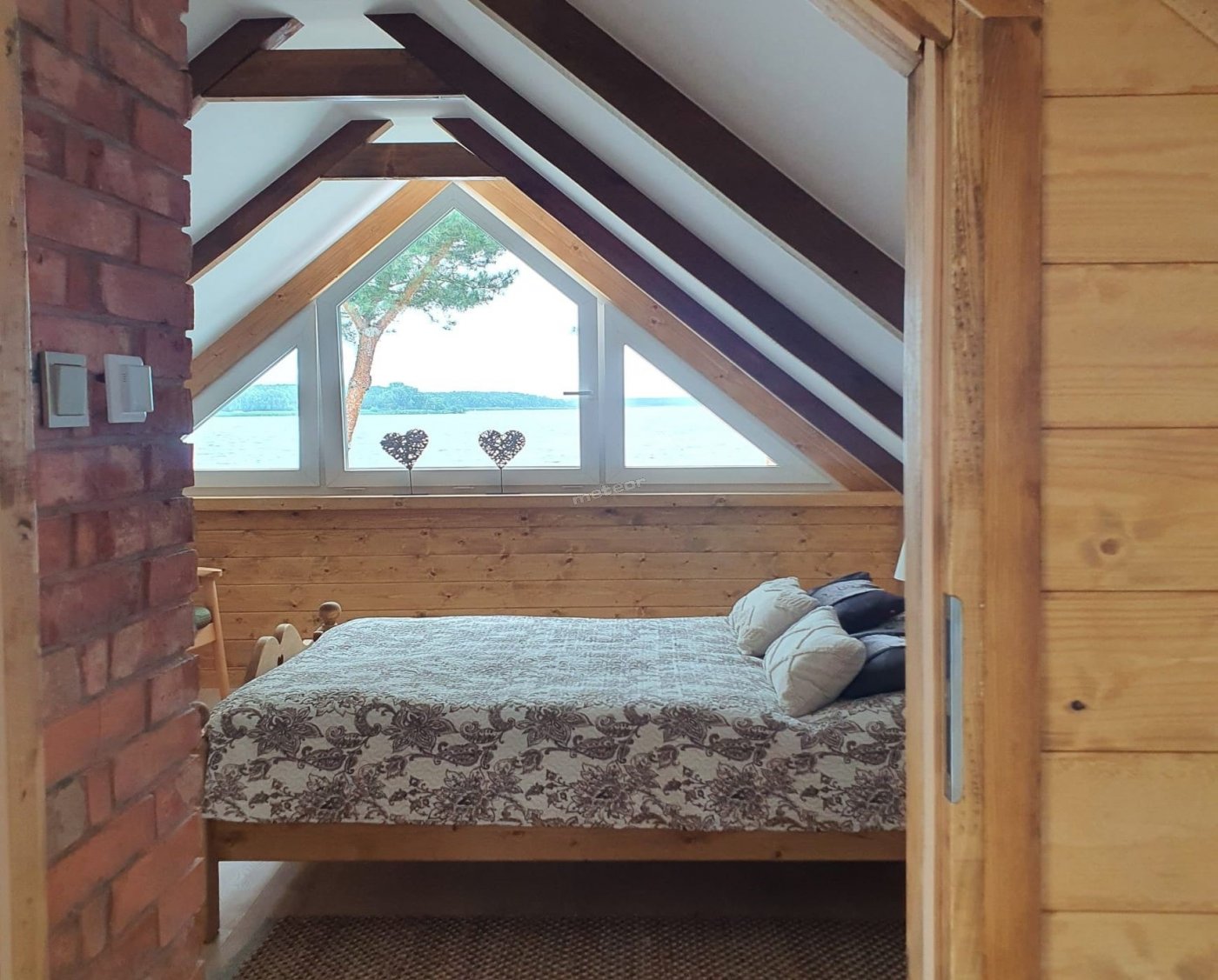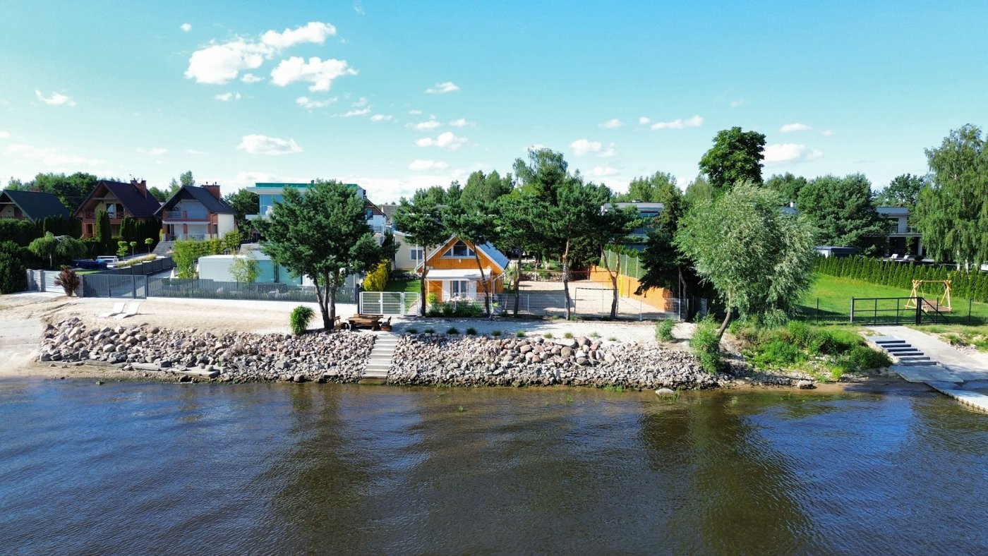Ganzjährig, aus Holz, mit 80 m² großem Dachgeschoss und direktem Zugang zum See. Vier Zimmer, drei Schlafzimmer (zwei mit Doppelbetten, eines mit Einzelbetten), ein großes Wohnzimmer, ein ausklappbares Ecksofa, eine Kommode mit 65-Zoll-TV und eine moderne, voll ausgestattete Küchenzeile. Badezimmer, WC mit Bidet, großem Waschbecken, ebenerdiger Dusche, Haartrockner und Handtüchern. Im Dachgeschoss gibt es ein separates Badezimmer, WC mit kleinem Waschbecken. Im Außenbereich gibt es eine 25 m² große überdachte und beleuchtete Terrasse (mit ausfahrbarer Markise) mit Aussicht und direktem Zugang zum See, einen Gartentisch und Stühle aus Holz für 6 Personen, zwei Gartenliegen, einen Gasgrill und zwei Parkplätze.