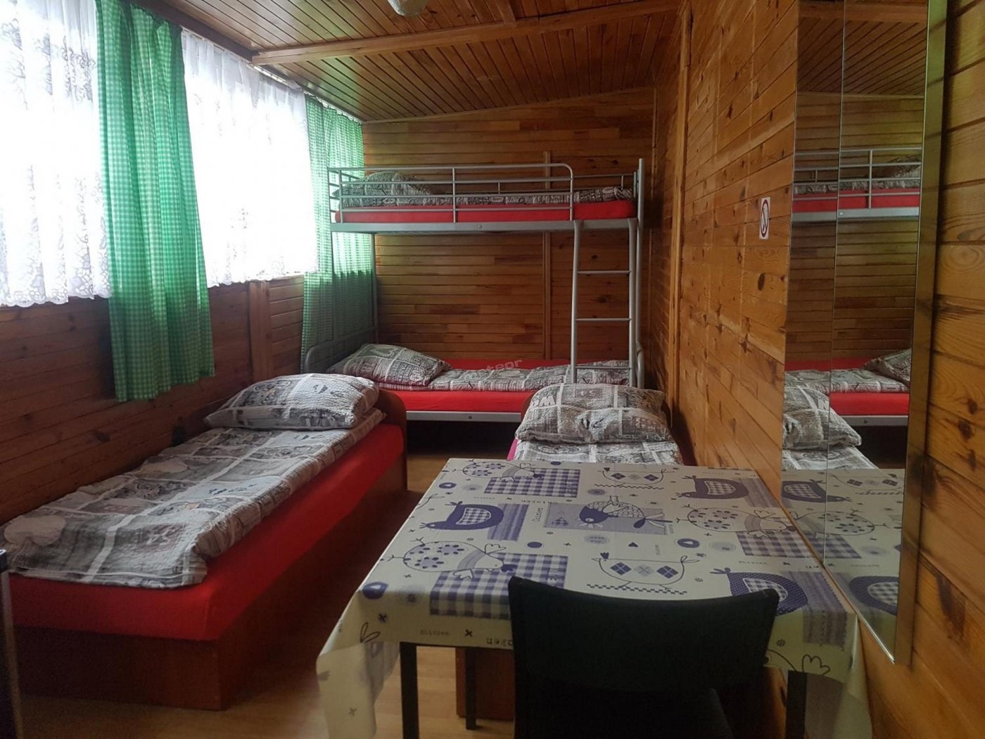 In der Hütte: ein großes Schlafzimmer mit einem Etagenbett, zwei Sofas.