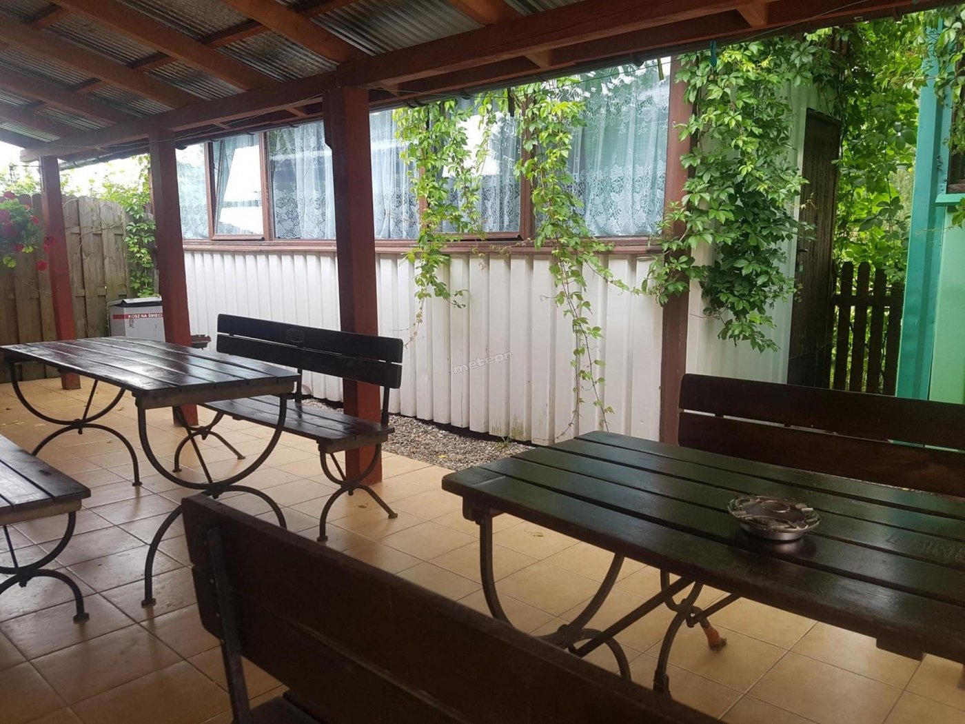 An der Hütte gibt es eine Terrasse mit Tischen und Bänken.