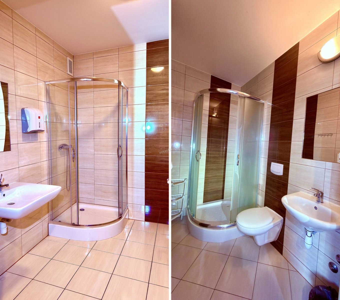 Wyposażenie łazienki: kabina prysznicowa, umywalka, WC.