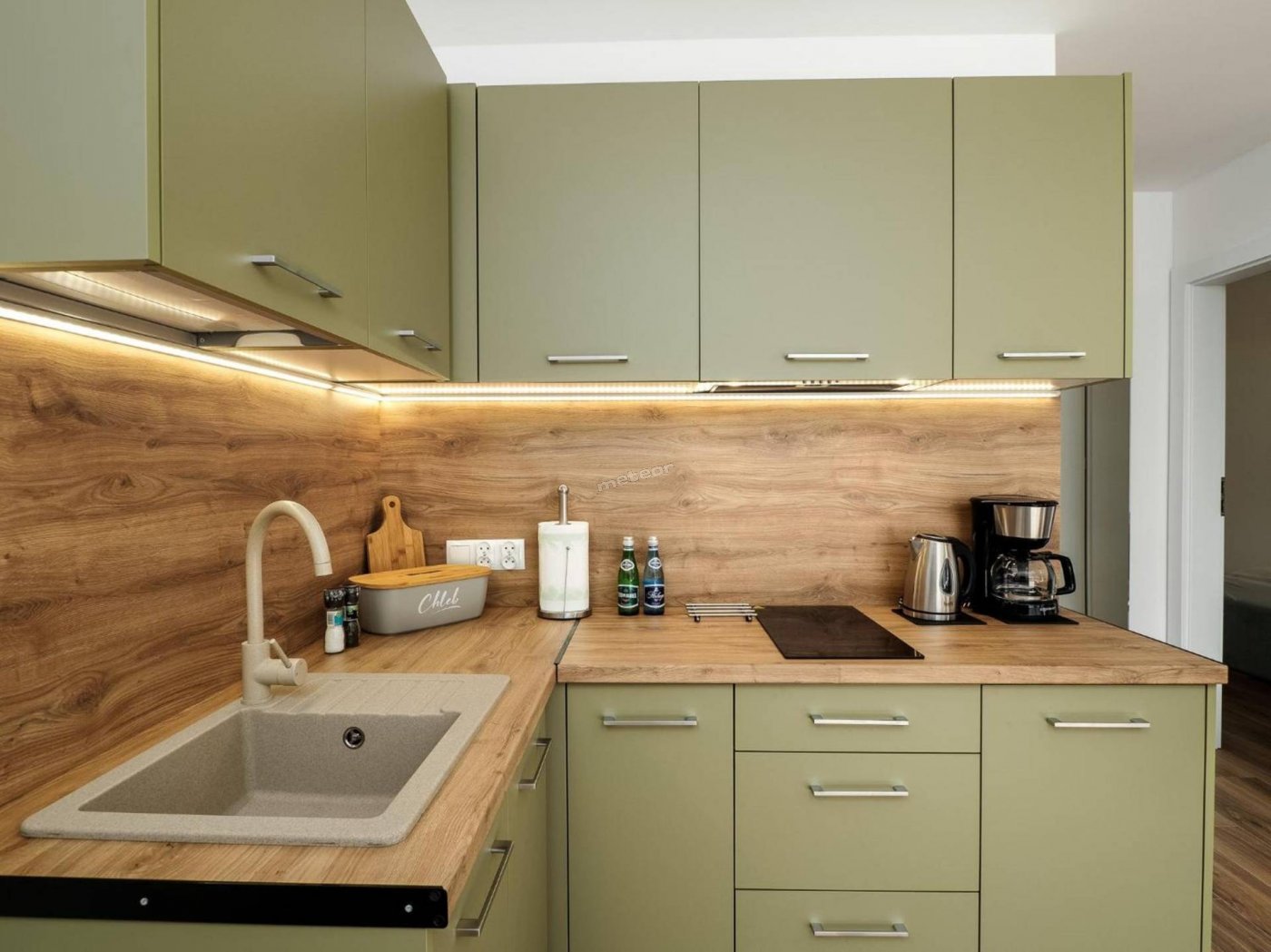 In the kitchen: kettle, coffee maker, stovetop, fridge, microwave.