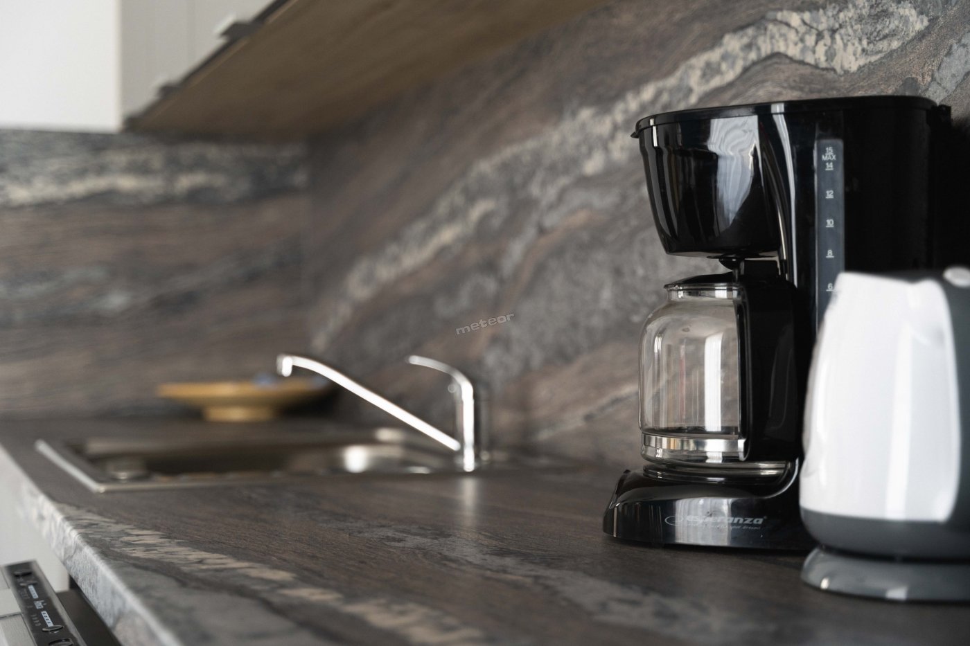 The comfortable kitchenette equipment includes an induction cooker, microwave, dishwasher, fridge, kettle, coffee maker, toaster, full tableware, cutlery and necessary accessories, pots, wine glasses.