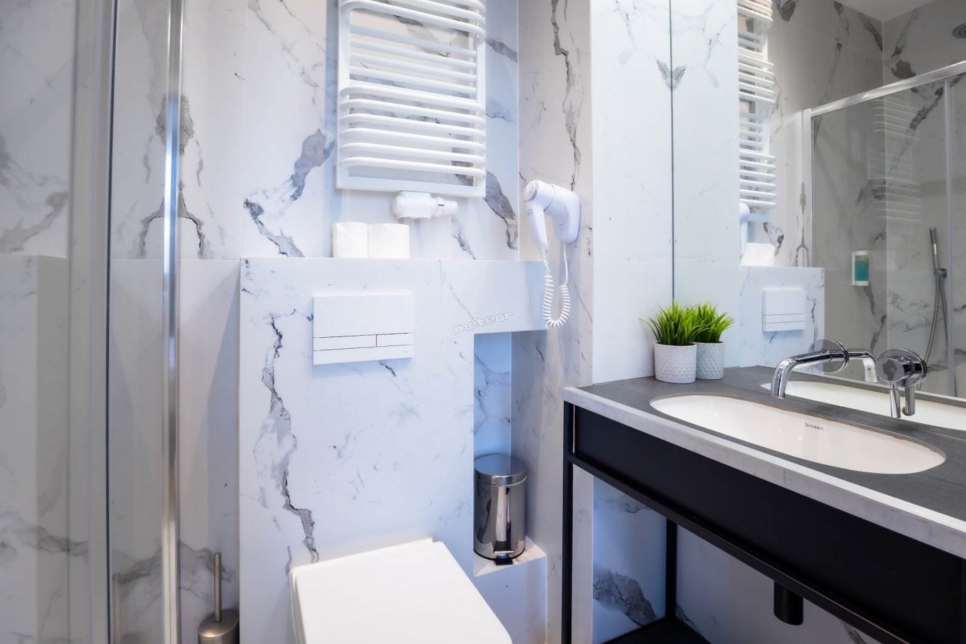 Bathroom equipment: shower cabin, washbasin, toilet, hairdryer, cosmetic set.