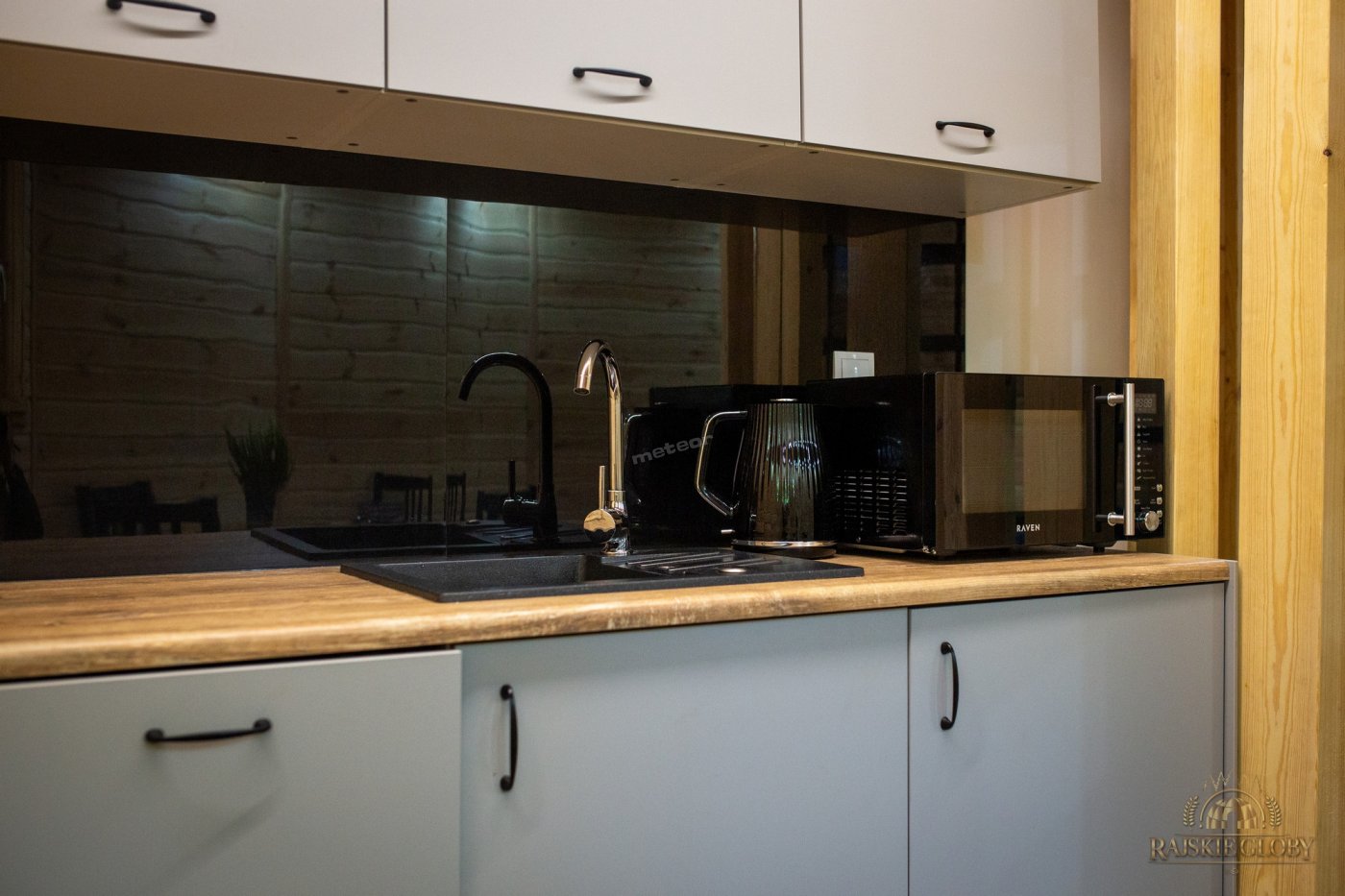 - kitchenette equipped with a hob, fridge, dishwasher, microwave, kettle, dishes,