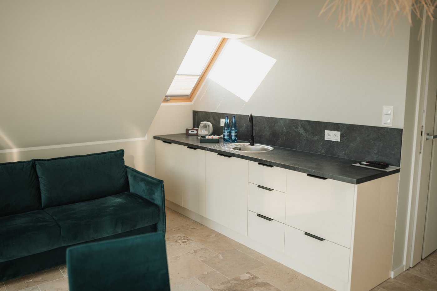 There is no cooking facility in the kitchenette. Equipment: kettle, plates, dishes, fridge, welcome set (coffee, tea, cream, sugar, water).