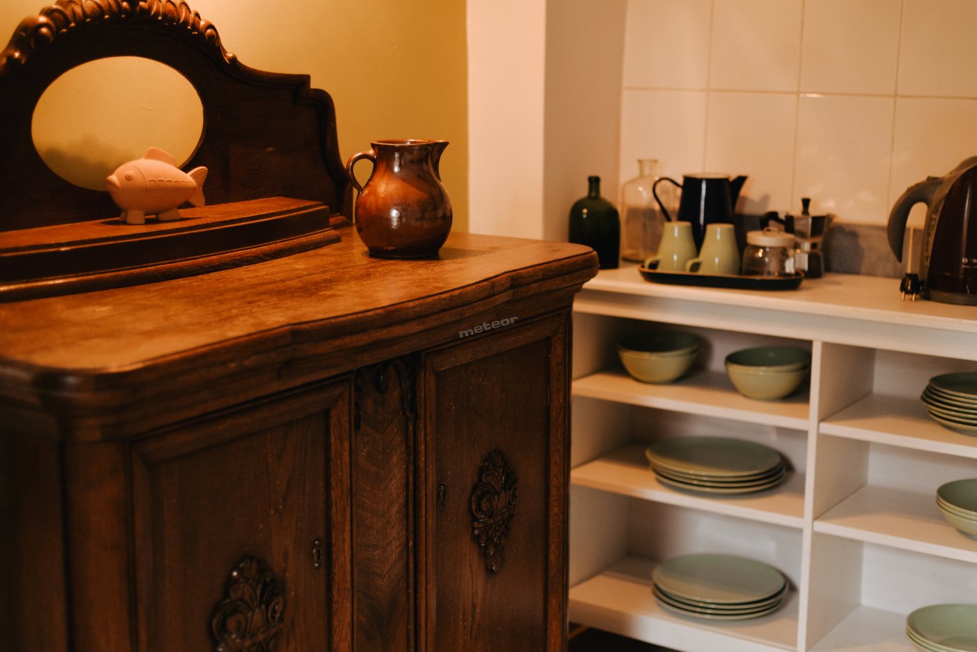 En la cocina: nevera, hervidor eléctrico, horno, tostadora, vajilla, cubiertos, cocina de gas.