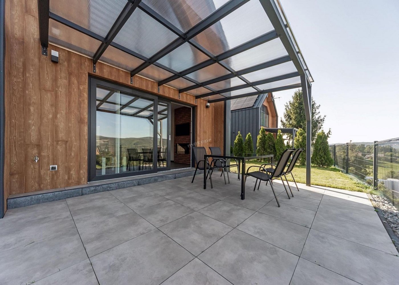 La casa dispone de una terraza cubierta con un conjunto de muebles de jardín, tumbonas y barbacoa.