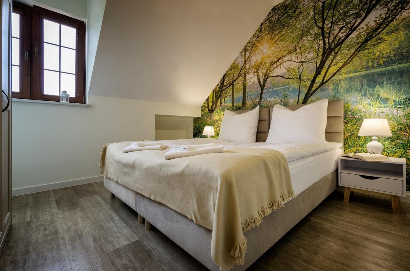 La instalación está situada en el corazón del parque paisajístico Krajeński, a orillas del lago Lutowskie, rodeada de bosques.