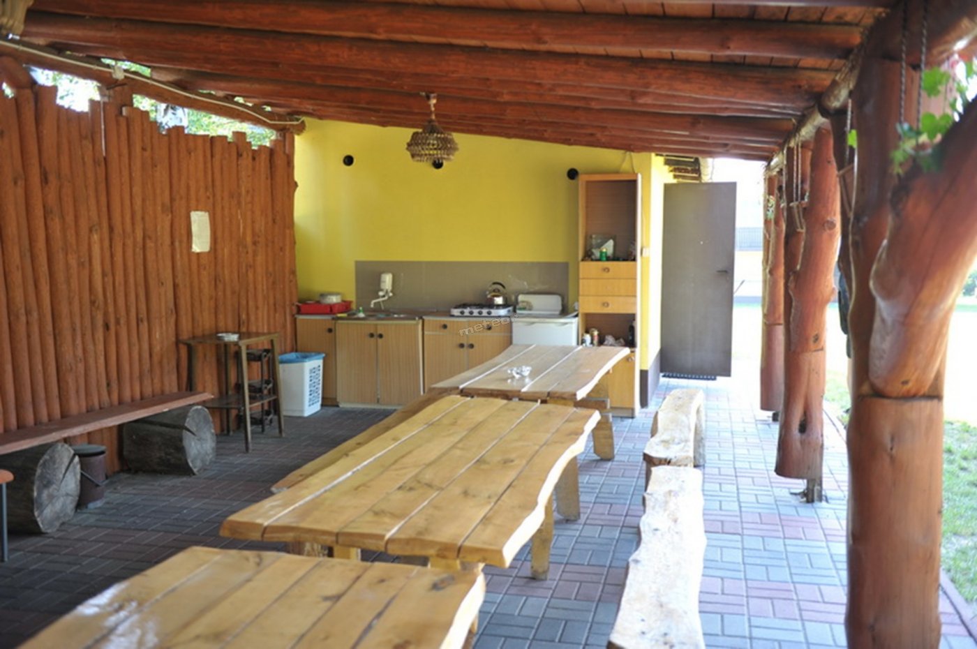 W obiekcie drewniana altana wykonana z balii drewnianych, w której można miło odpocząć nawet w czasie deszczu.