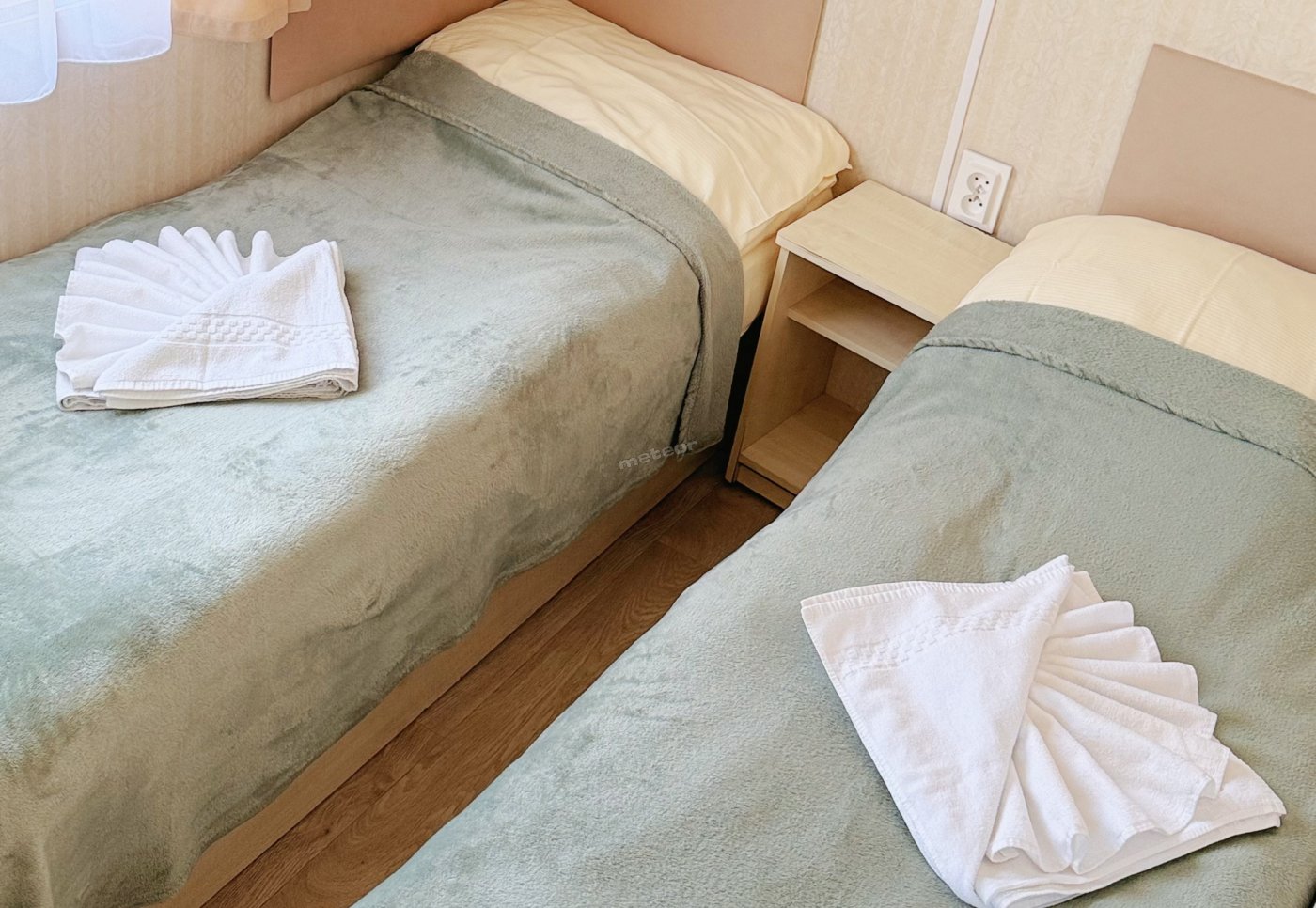 Case estive: monolocale - due letti singoli, divano letto pieghevole, frigorifero, bollitore elettrico, set di stoviglie e asciugamani.