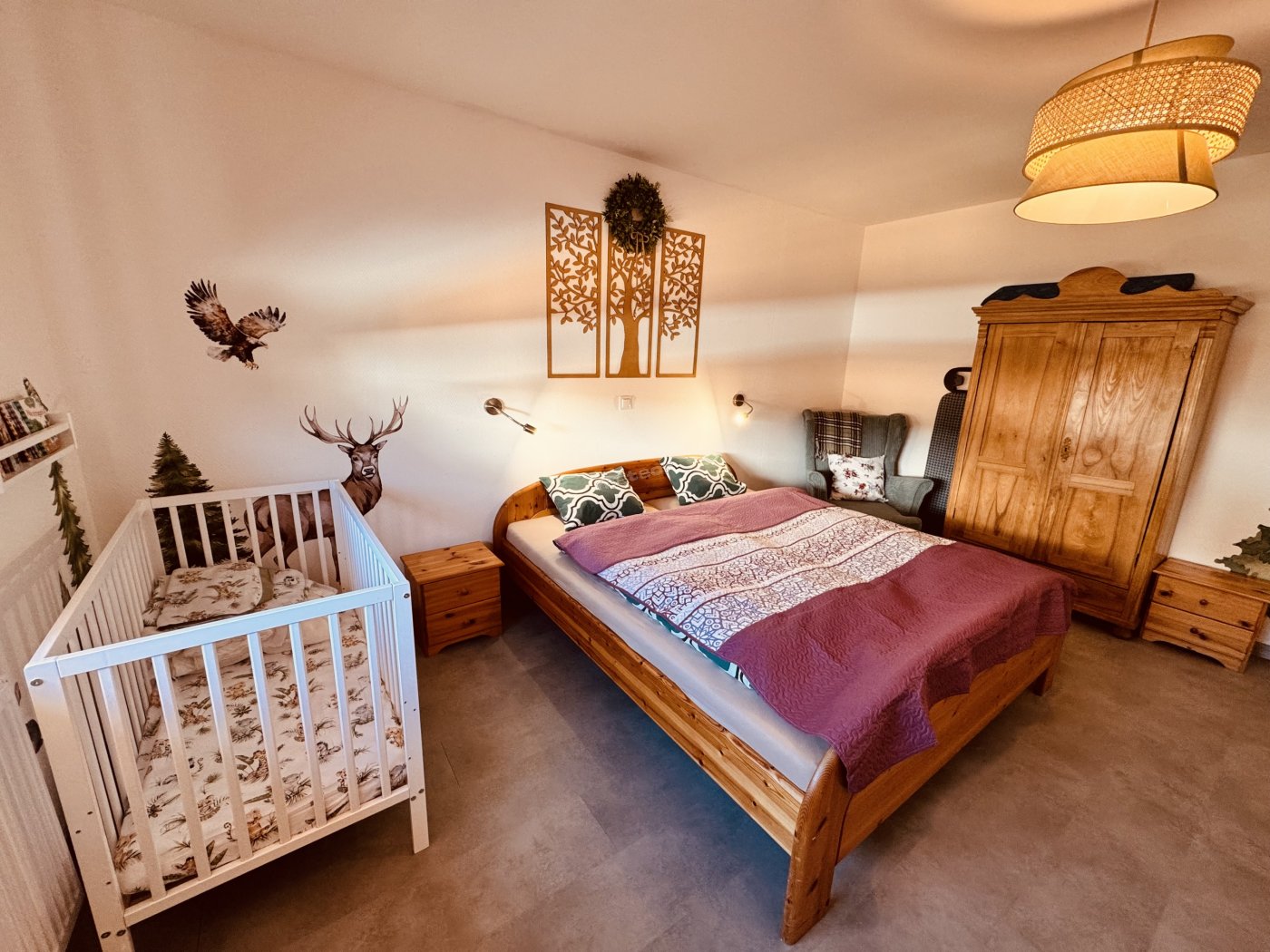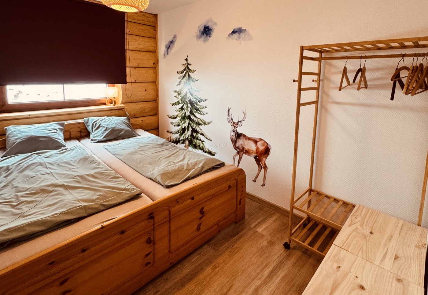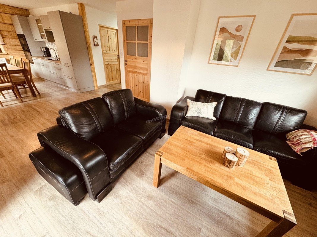 L'appartamento per 5 persone a Rudolf è dotato di due camere da letto (una matrimoniale, l'altra tripla), una culla, un bagno, una cucina e un soggiorno con camino.