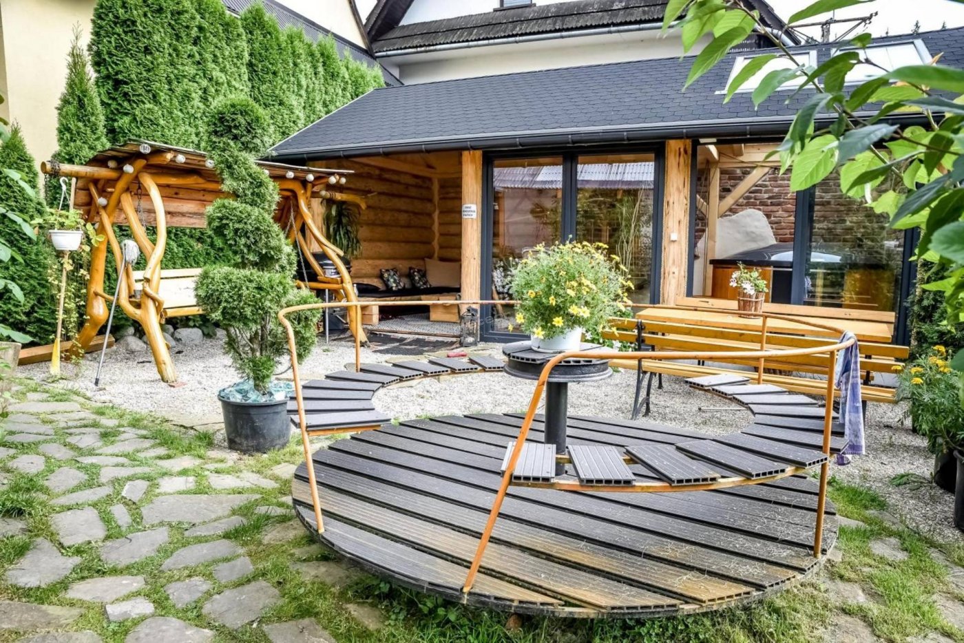 Parco giochi per bambini (casetta, giostra, trampolino e altalene).