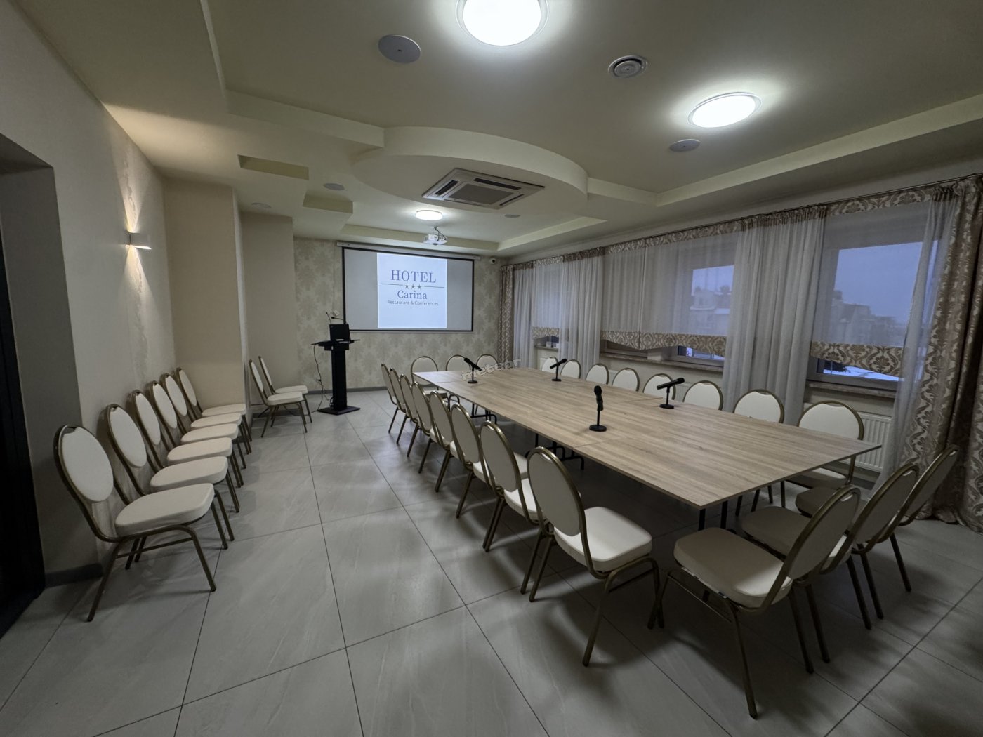 Disponiamo di 5 sale polifunzionali con un totale di 250 posti a sedere, dotate di: proiettore, lavagna a secco, lavagna a fogli mobili, TV, impianto audio con microfoni wireless, lettore CD o registratore, materiale per ufficio, leggio e diverse disposizioni di tavoli.