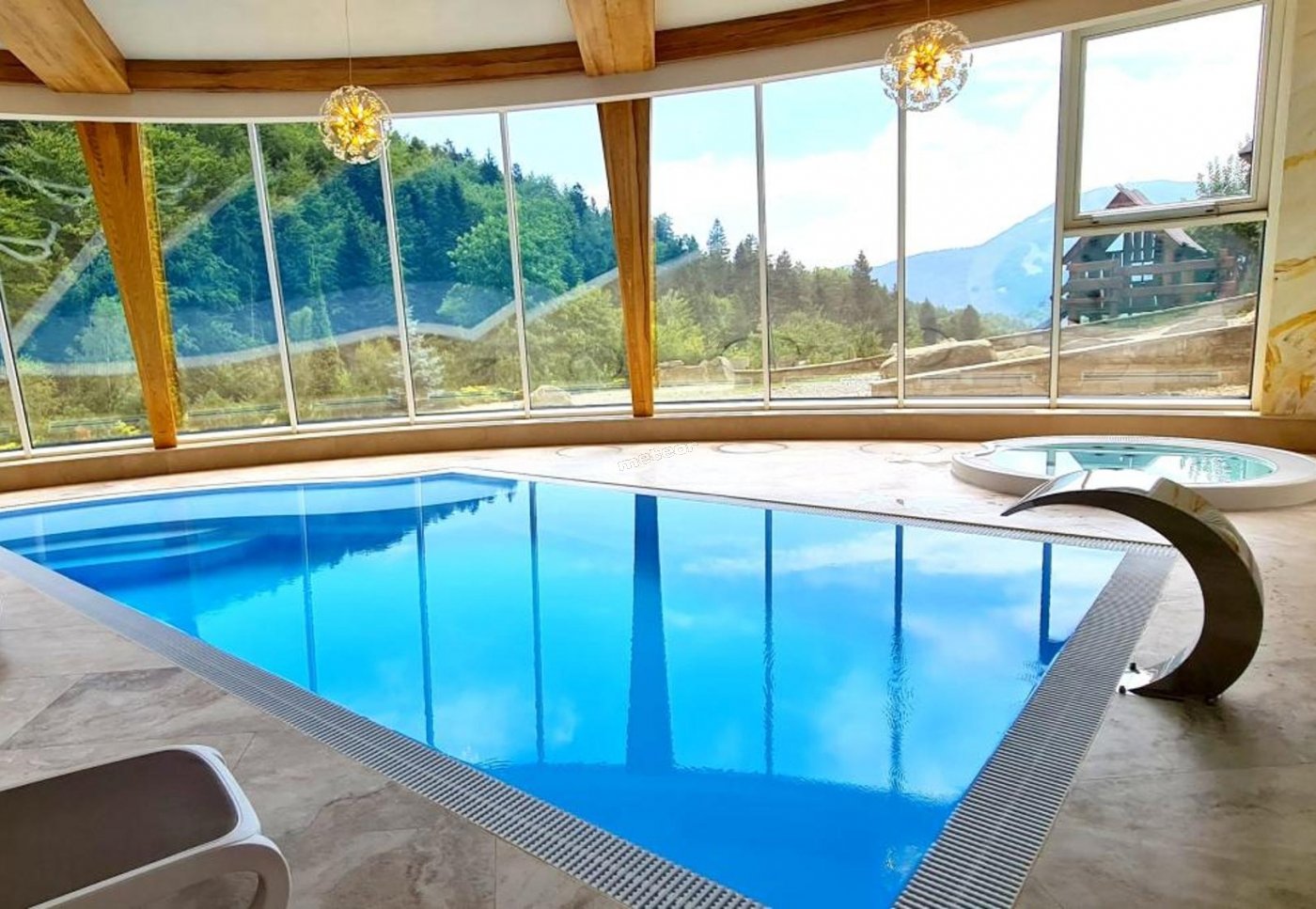 W części wewnętrznej znajdują się: basen z widokiem na panoramę Skrzycznego, sauna fińska cedrowa dla 4-6 osób, oraz jacuzzi z masażem wodnym.