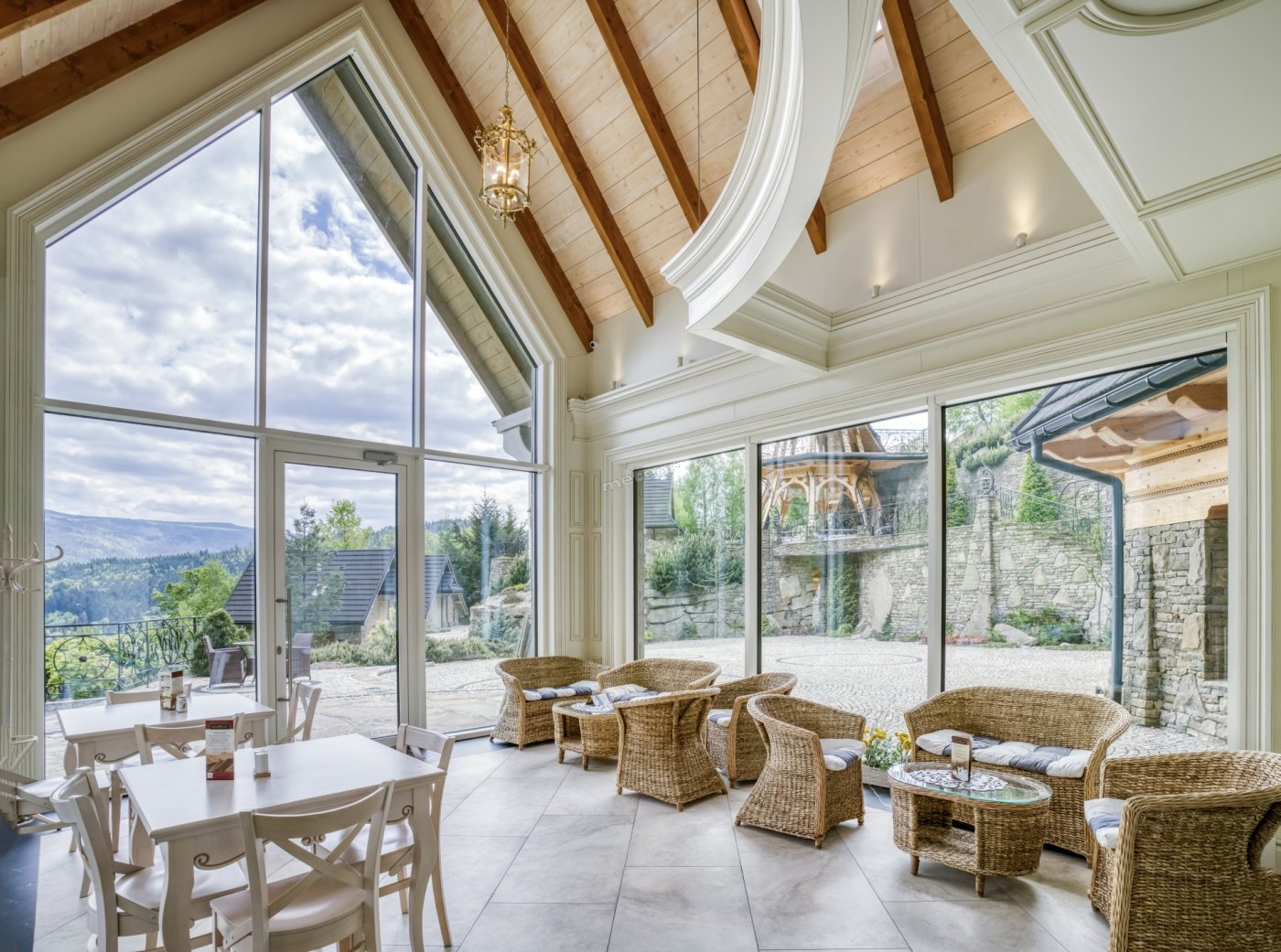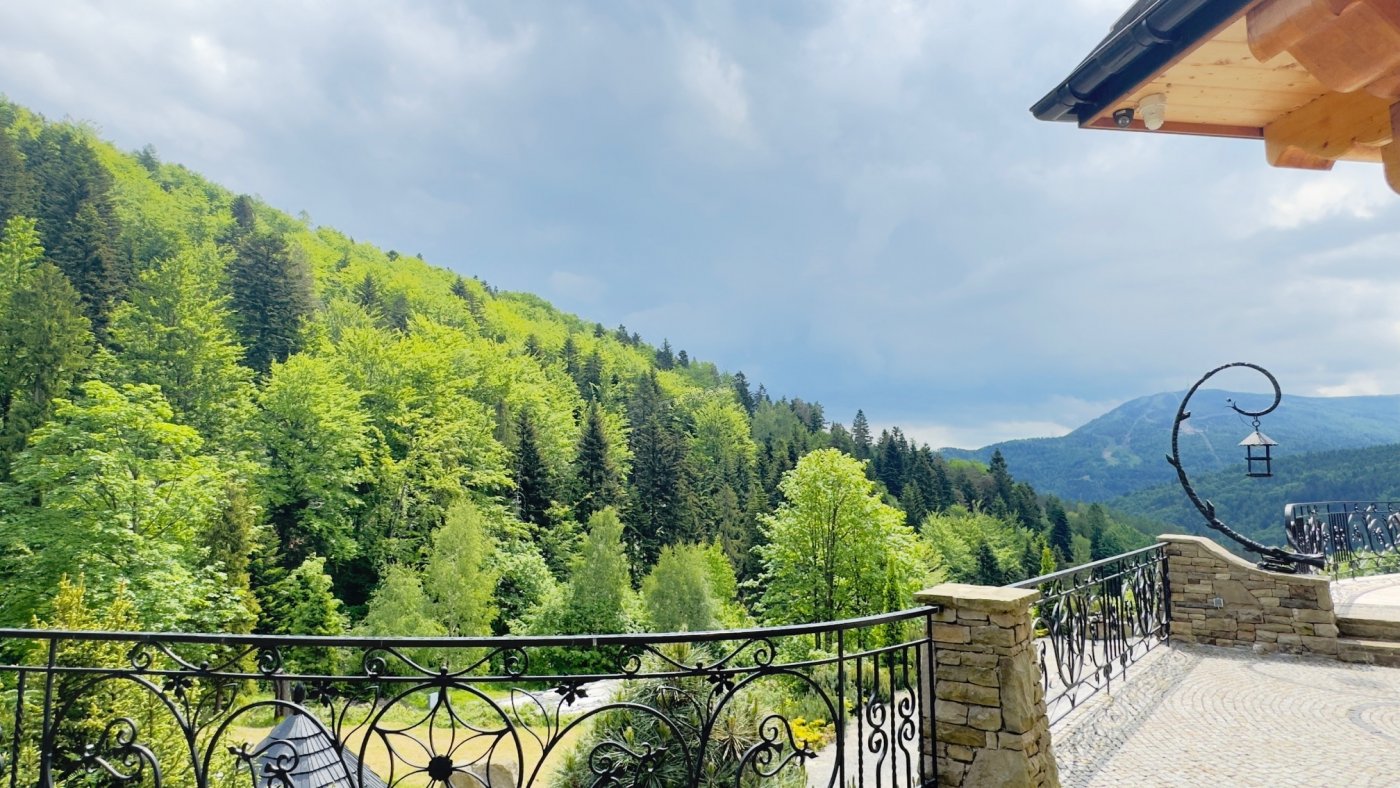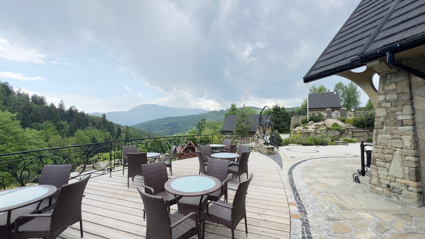 Z restauracji i kawiarni roztaczają się niesamowite widoki na szczyty Beskidów.