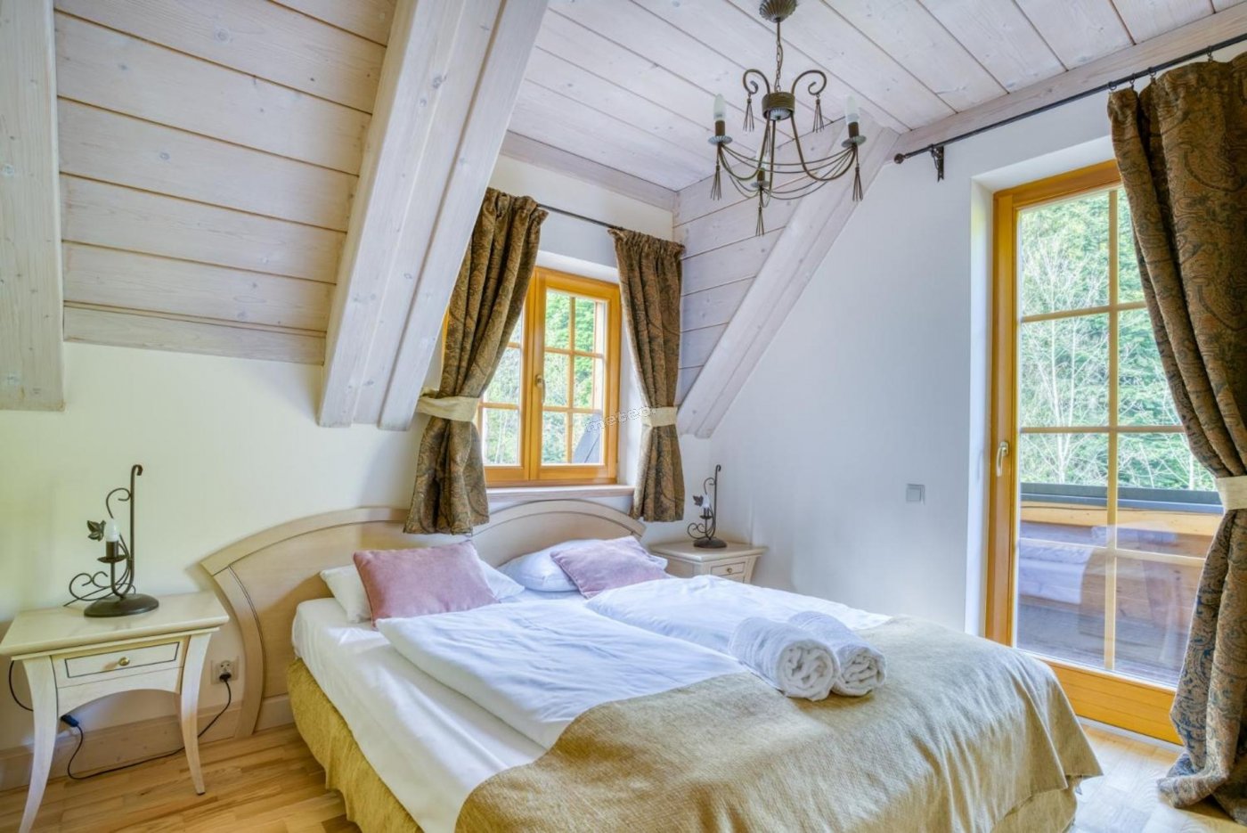 W domku: 2 sypialnie, otwarta przestrzenna antresola na piętrze, przeszklony salon z kominkiem i wyjściem na balkon, 2 łazienki, aneks kuchenny.
