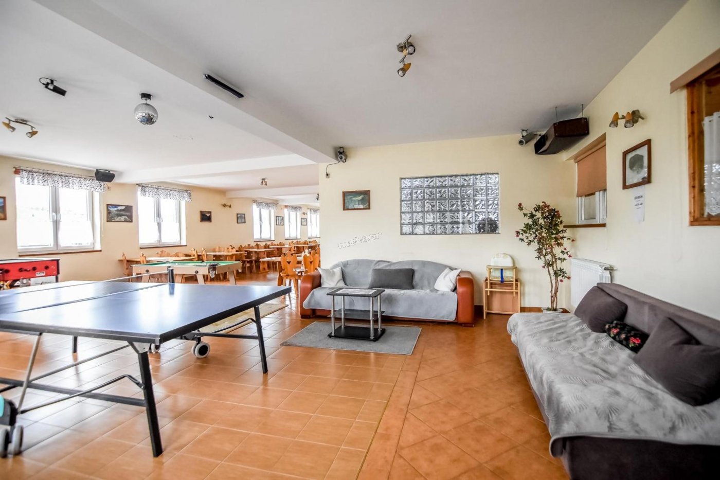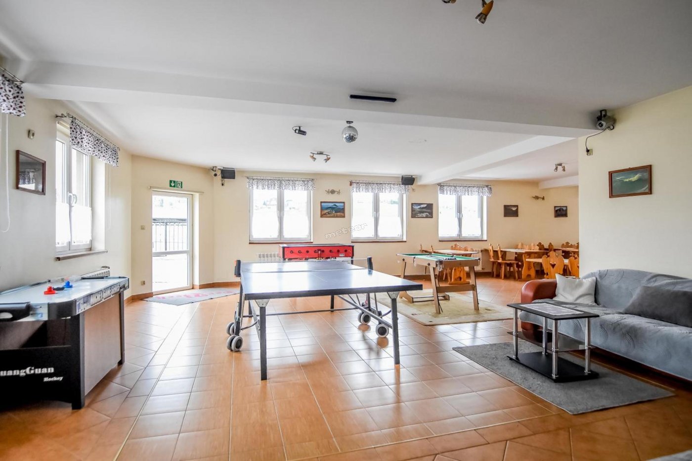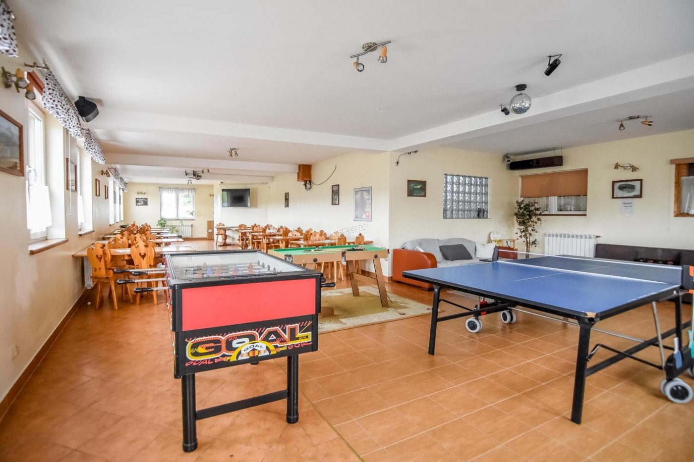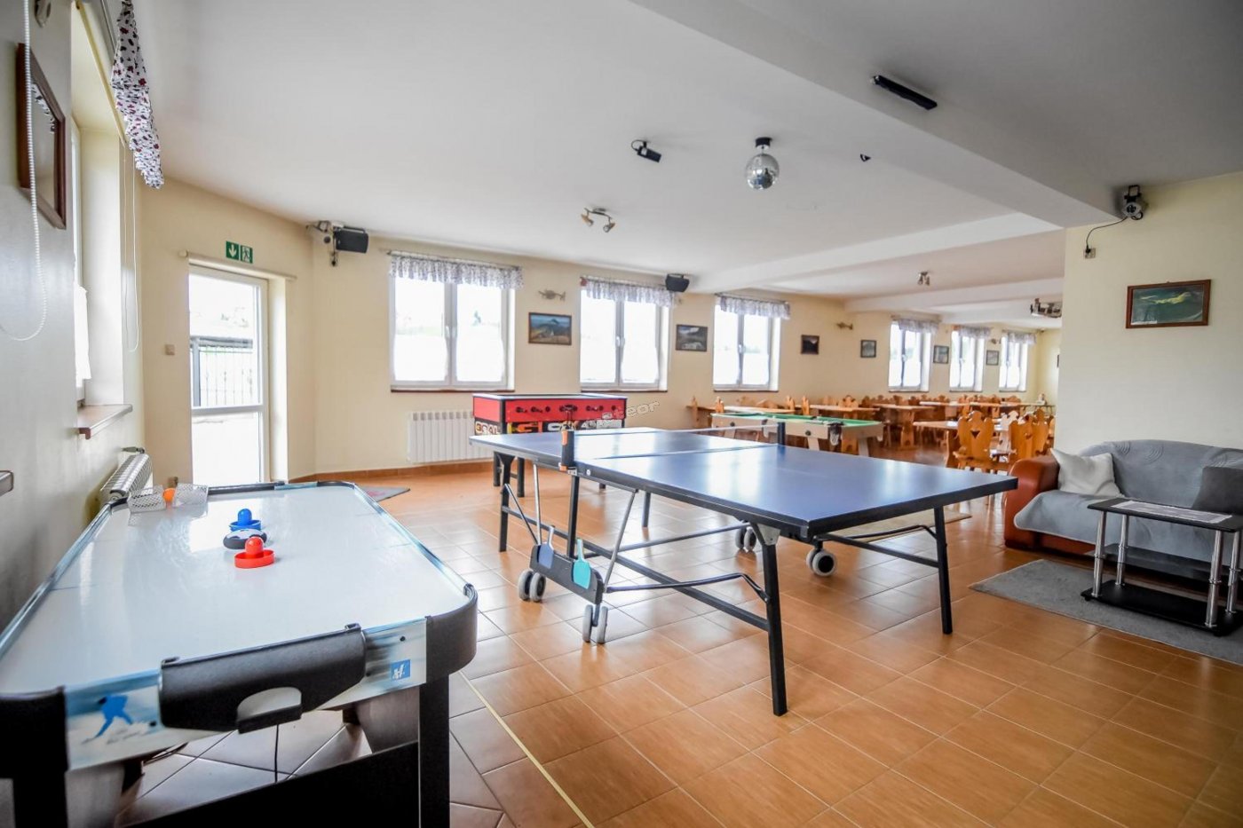 Do dyspozycji gości: kącik zabaw, plac zabaw, trampolina, huśtawki, piłkarzyki, tenis stołowy - ping-pong, minibilard, cymbergaj, sala do tańczenia, boisko do siatkówki, boisko do koszykówki.