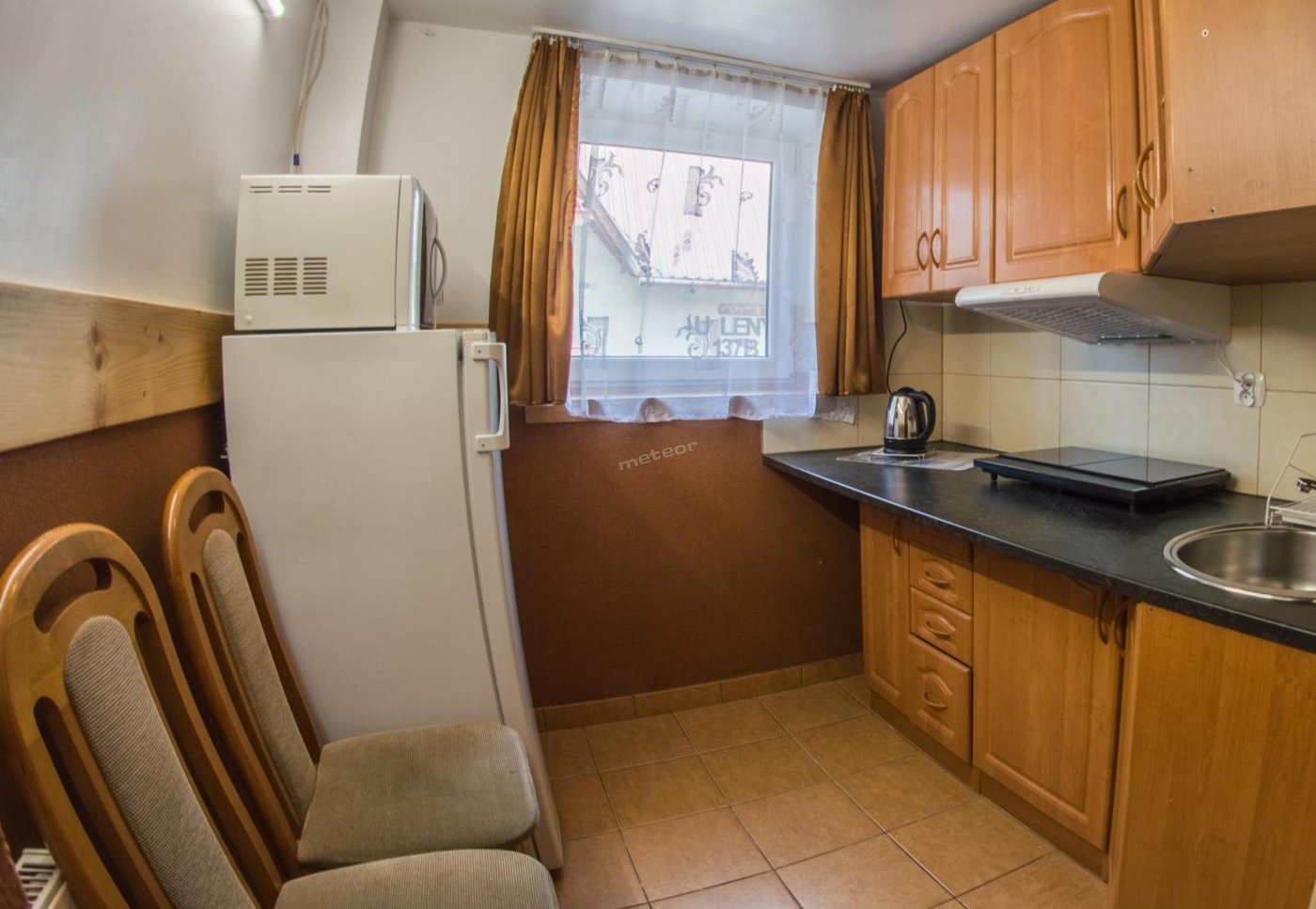 W aneksie kuchennym: lodówka, kuchenka mikrofalowa, czajnik, naczynia.