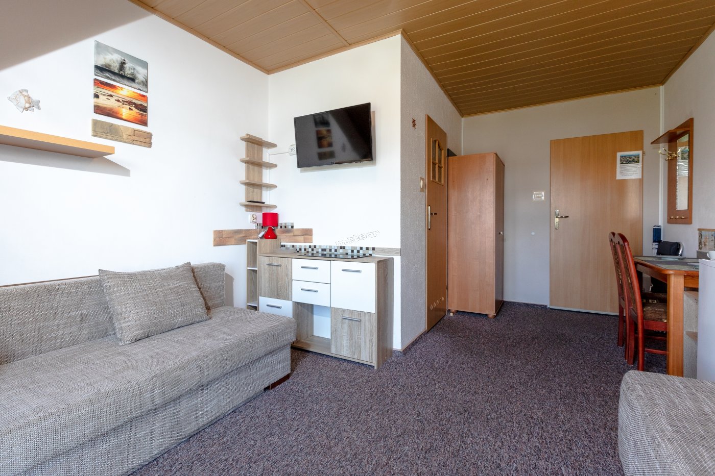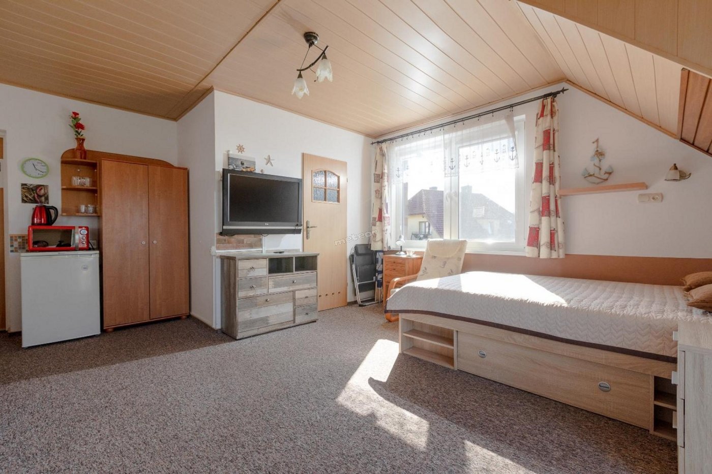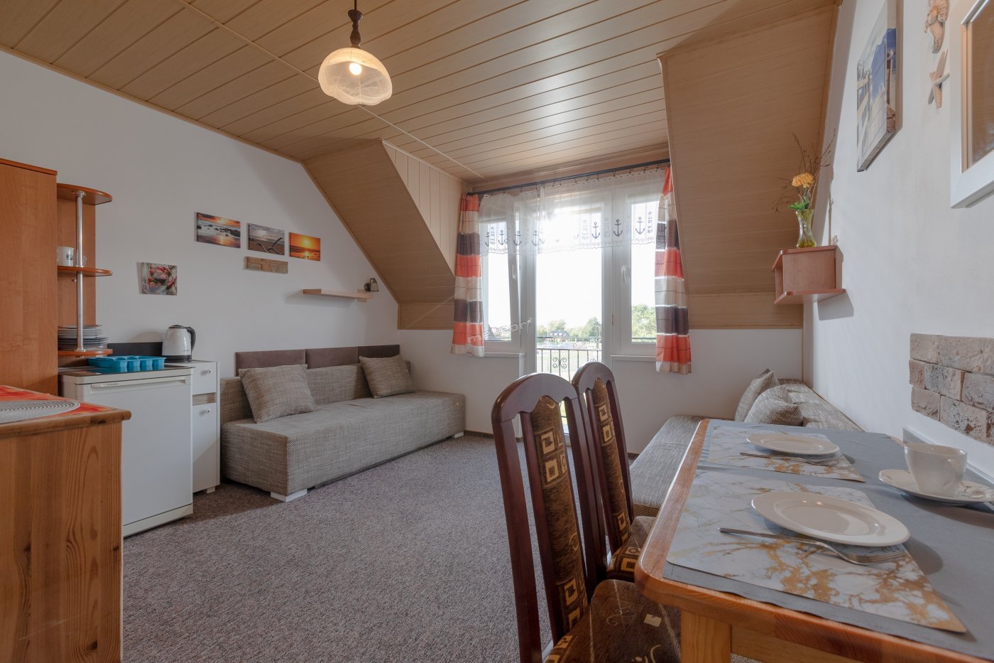 Goście mogą korzystać ze wspólnego aneksu kuchennego (lodówka, czajnik elektryczny, płyta indukcyjna).