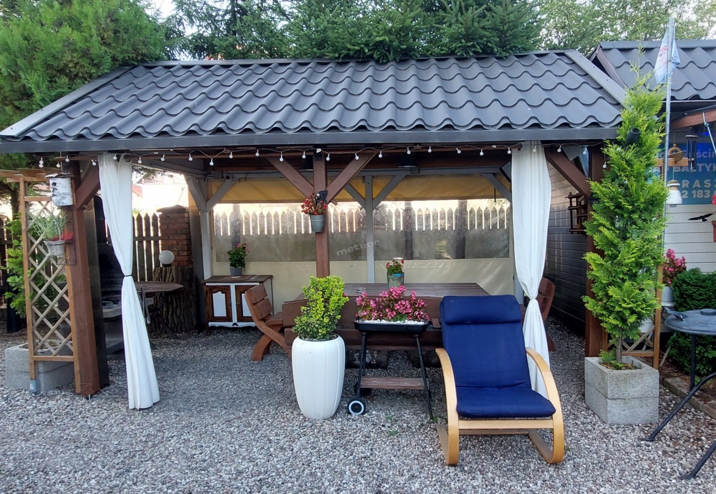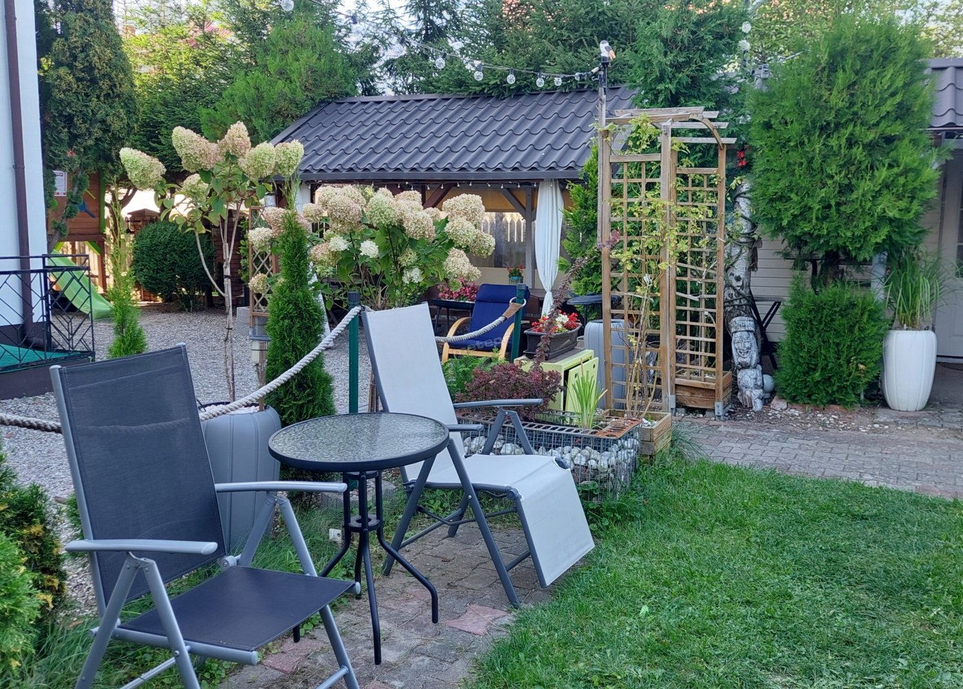 W ogrodzie krzesła i lezaki, grill
