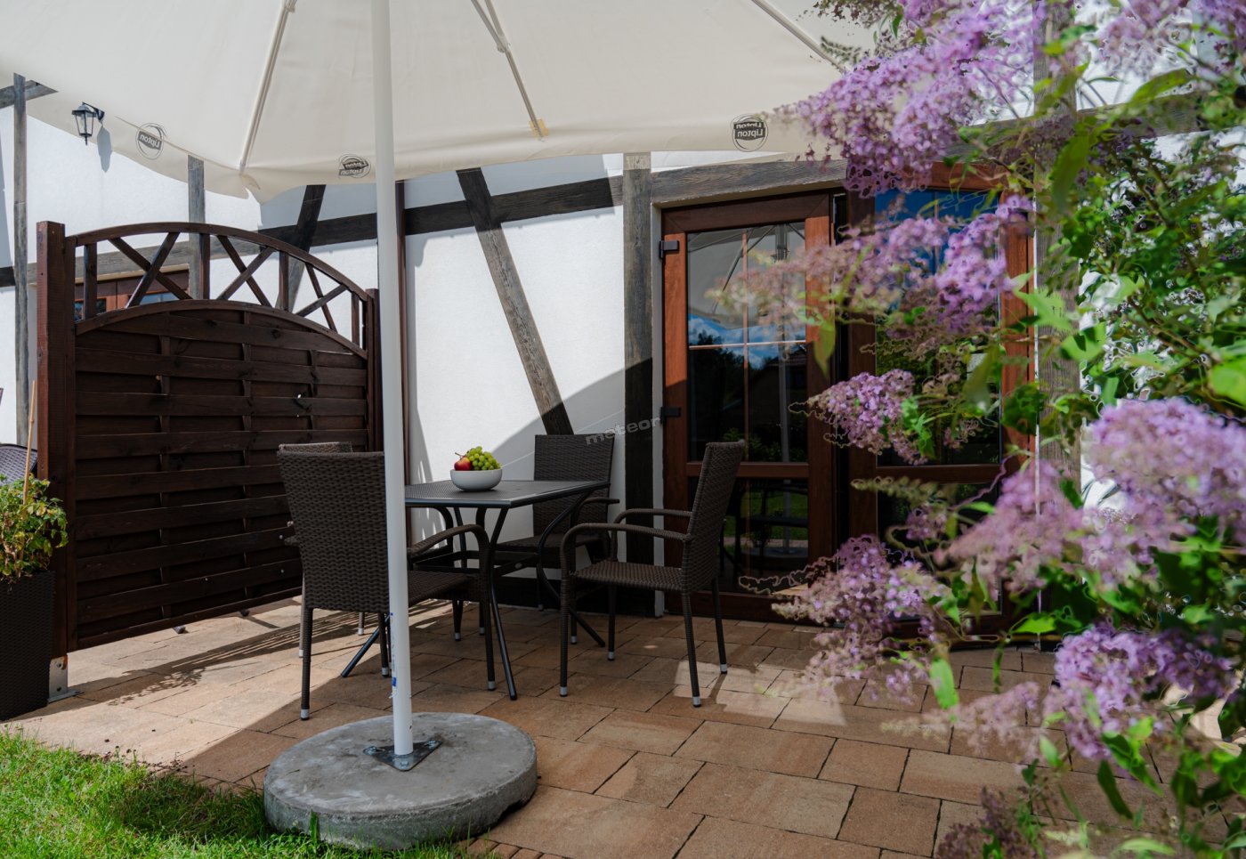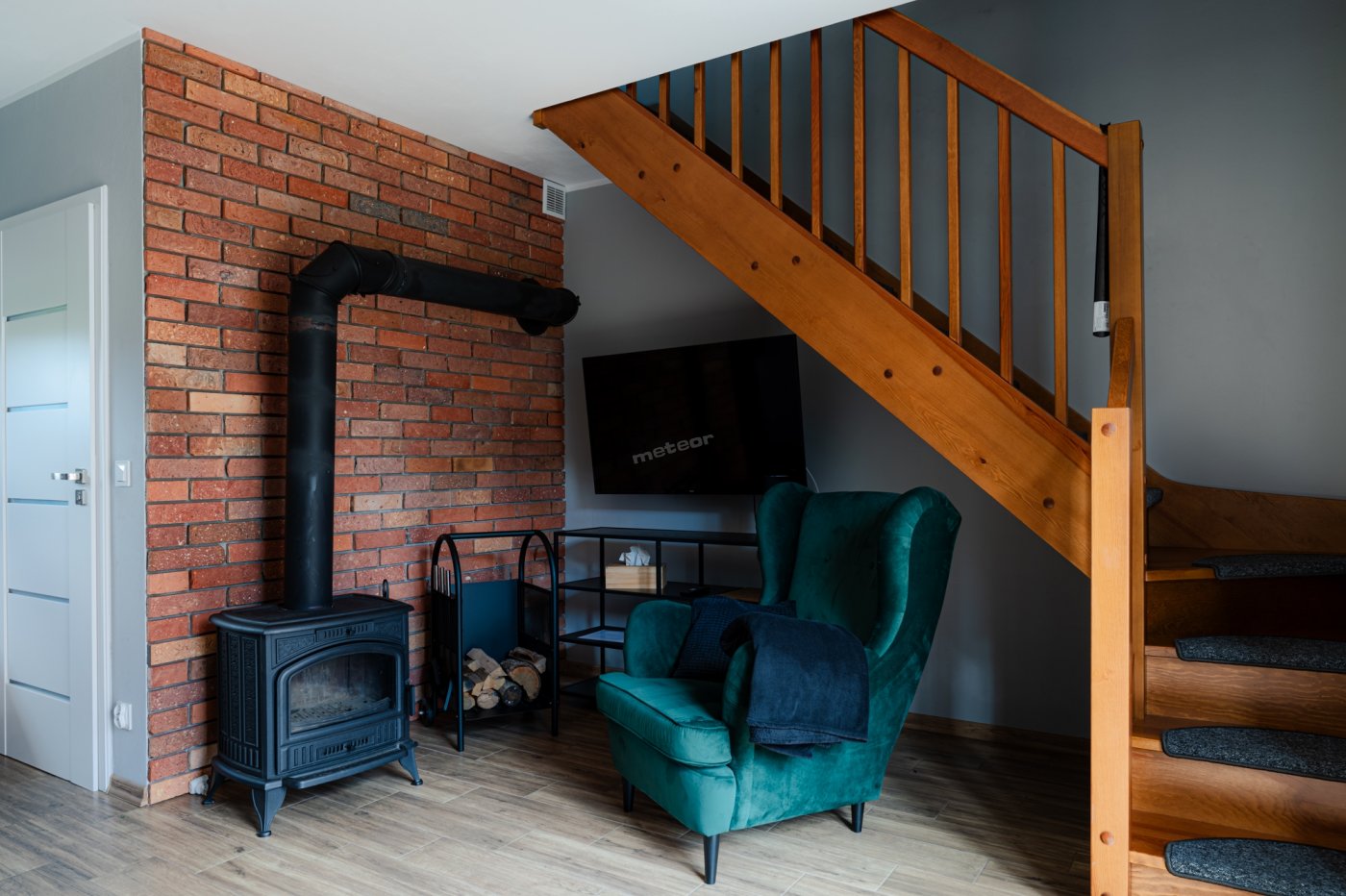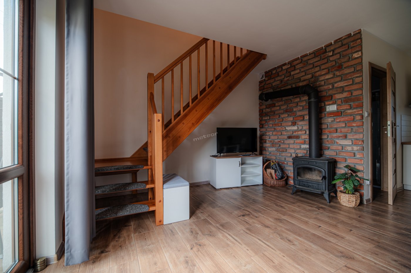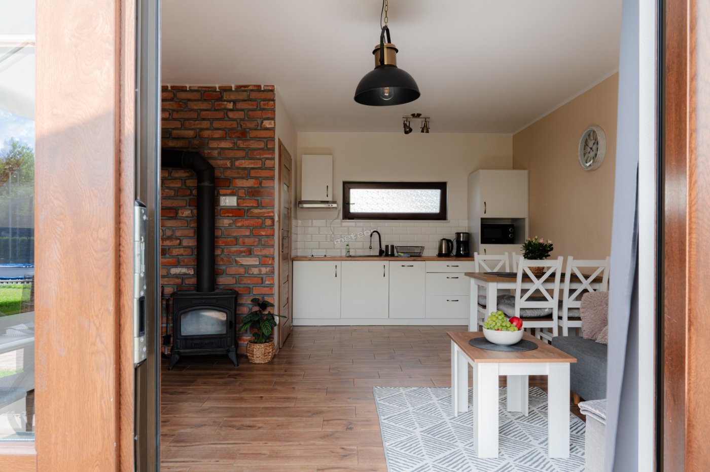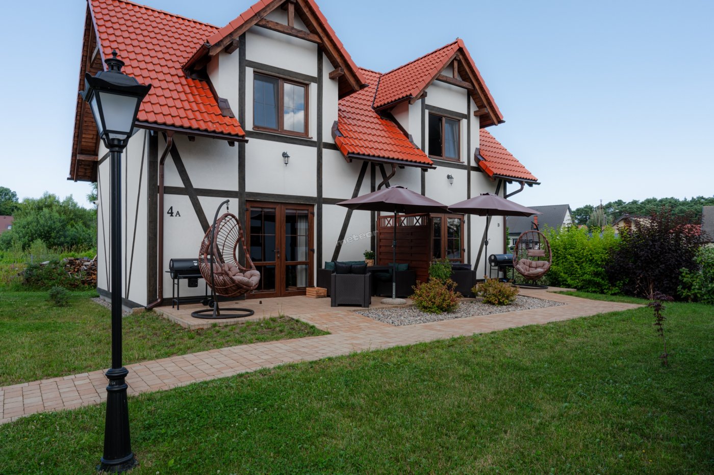 Na piętrze są 2 sypialnie i toaleta, na parterzet: kompleksowo wyposażona kuchnia (płyta kuchenna, czajnik, lodówka, zmywarka, ekspres do kawy, garnki, kuchenka mikrofalowa, zastawa stołowa), salon z częścią jadalnianą, łazienka oraz taras, na którym jest stolik, krzesła i przenośny grill.