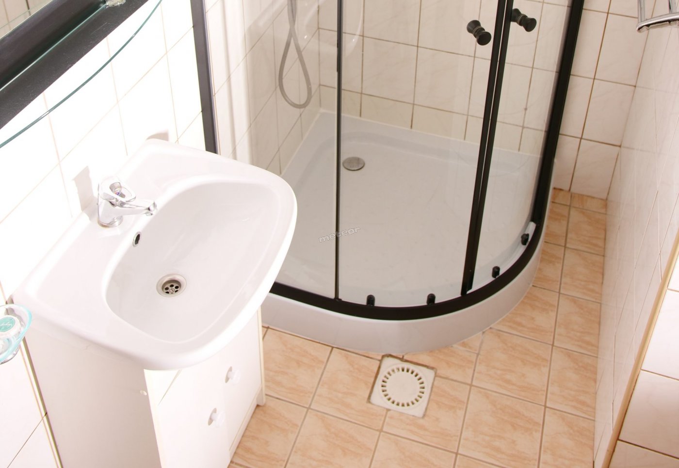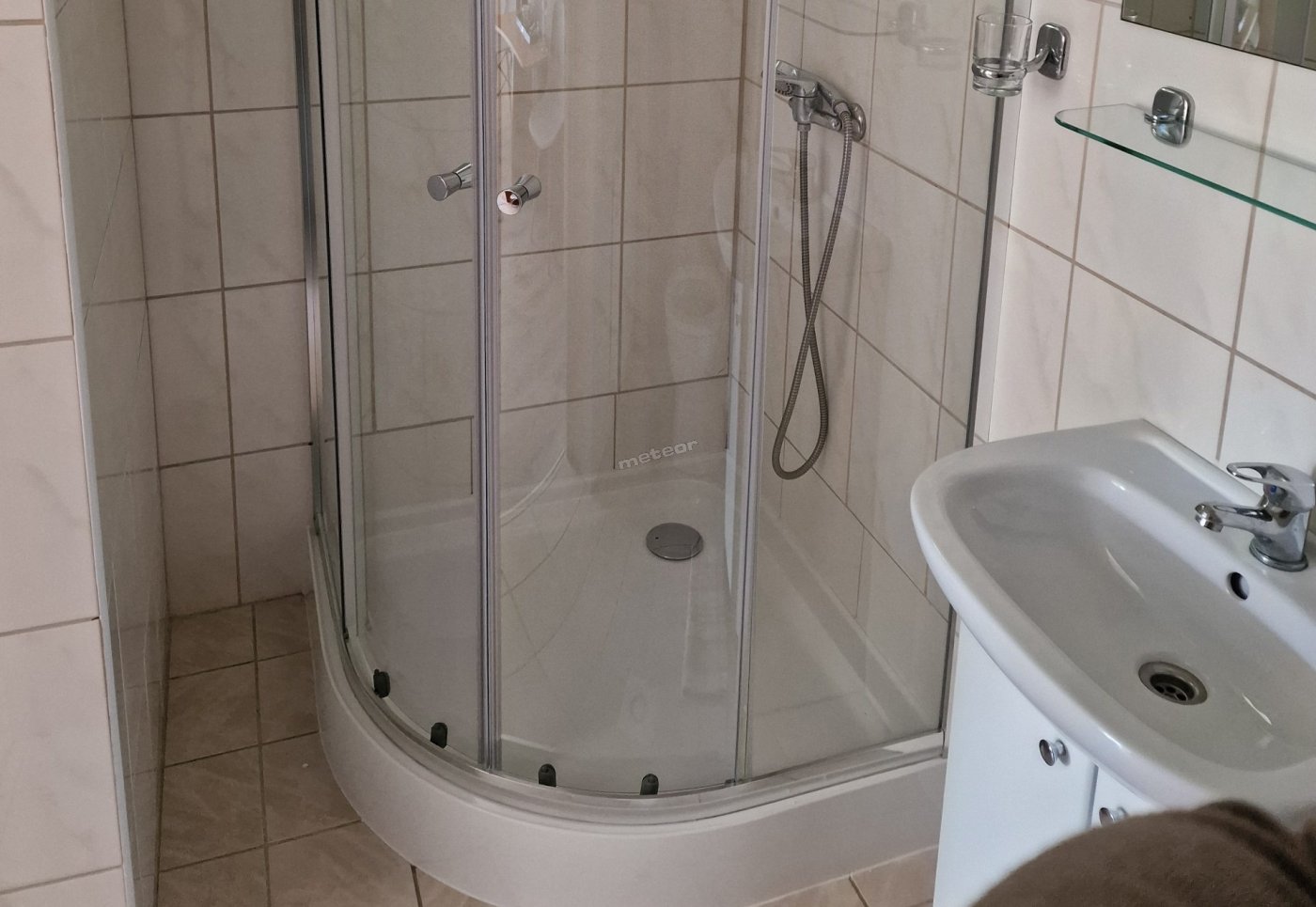 W łazience: prysznic, komplet ręczników.