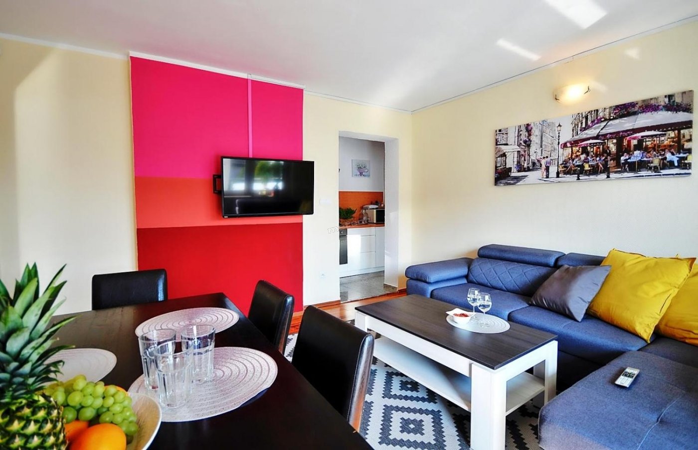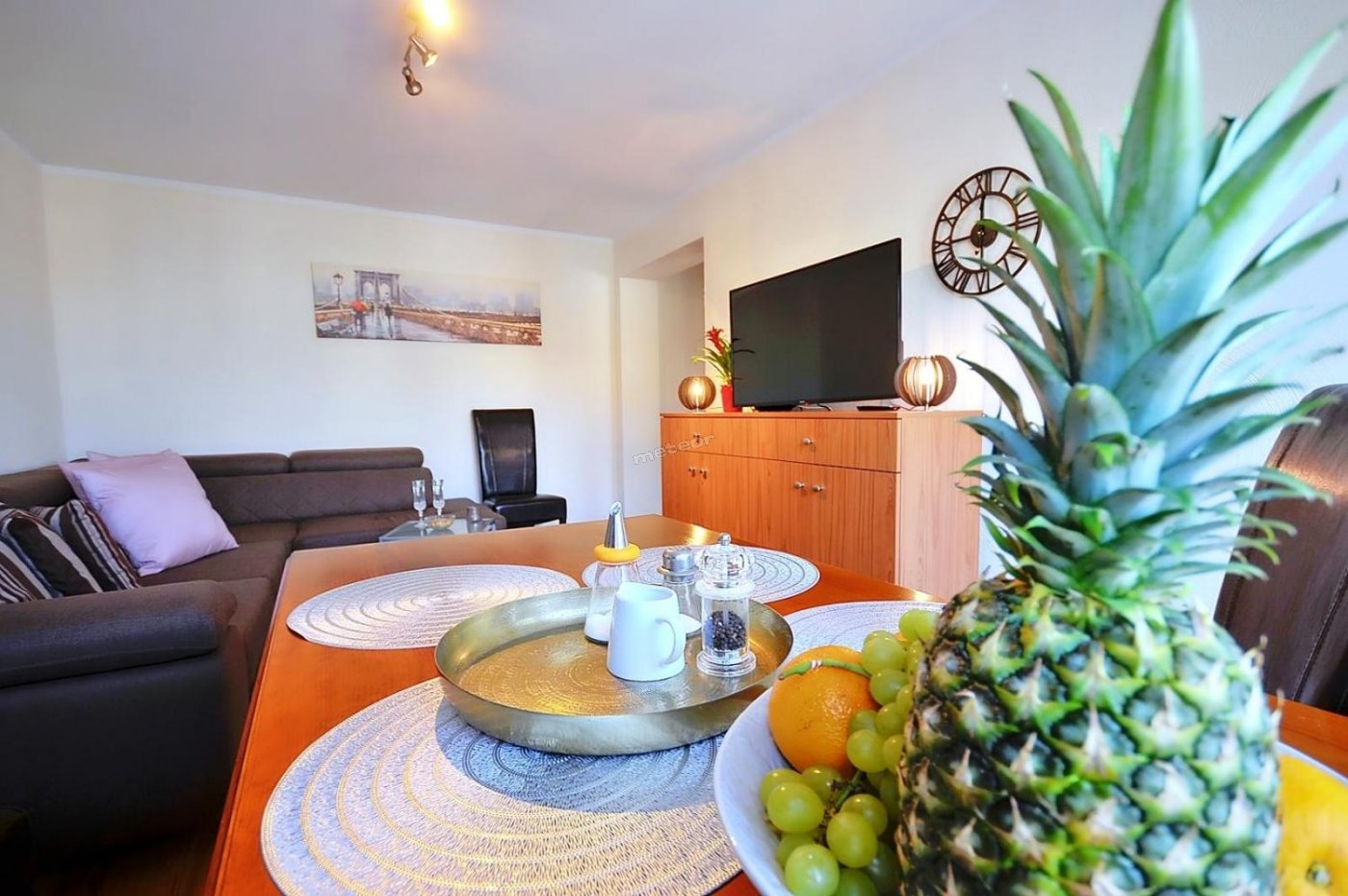 Mieszkanie posiada: sypialnię, salon z TV, kompletnie wyposażoną kuchnię oraz łazienkę.
