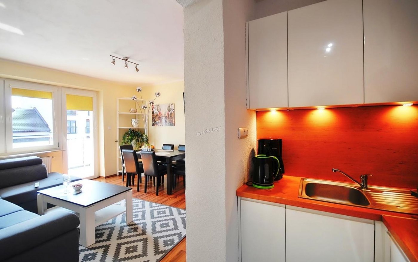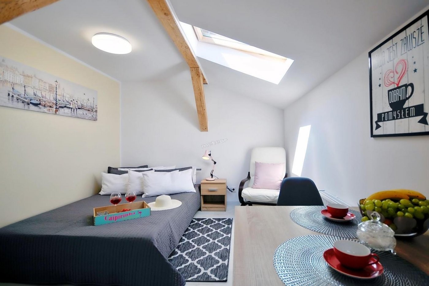 W aneksie: lodówka, kuchenka, ekspres do kawy, czajnik, zmywarka, kuchenka mikrofalowa.