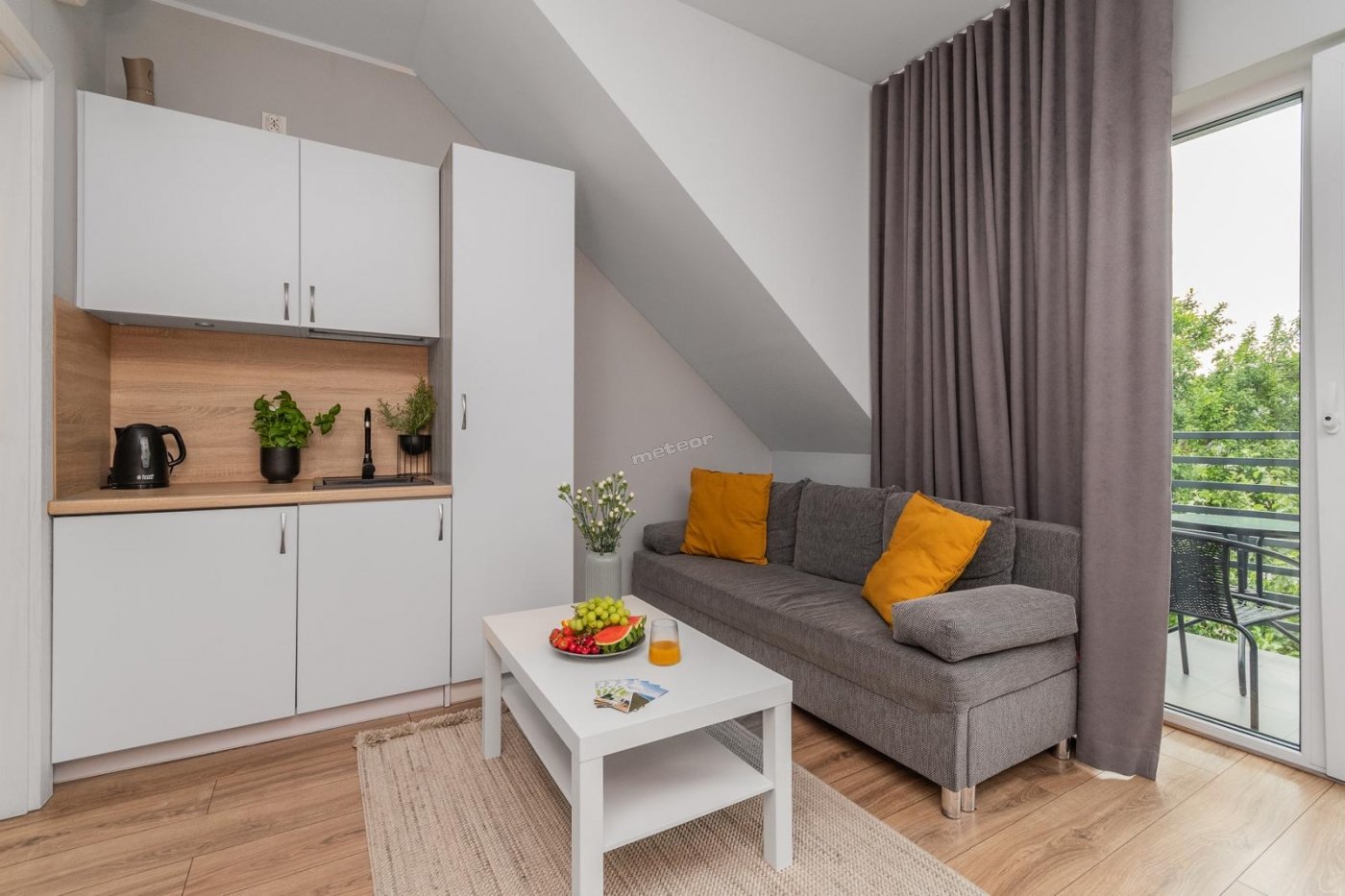Studia i apartamenty posiadają aneksy kuchenne, balkony lub tarasy, oprócz apartamentu na piętrze.