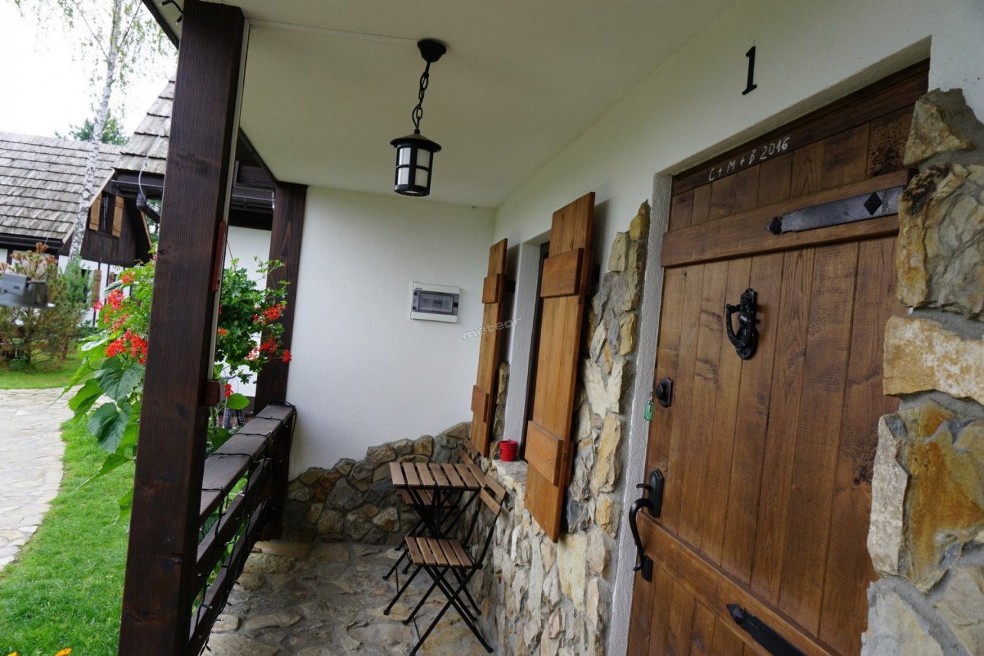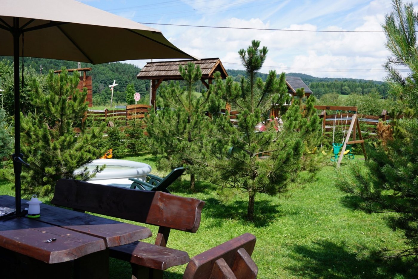 В каждом коттедже есть деревянный стол с мангалом и зонтиком.