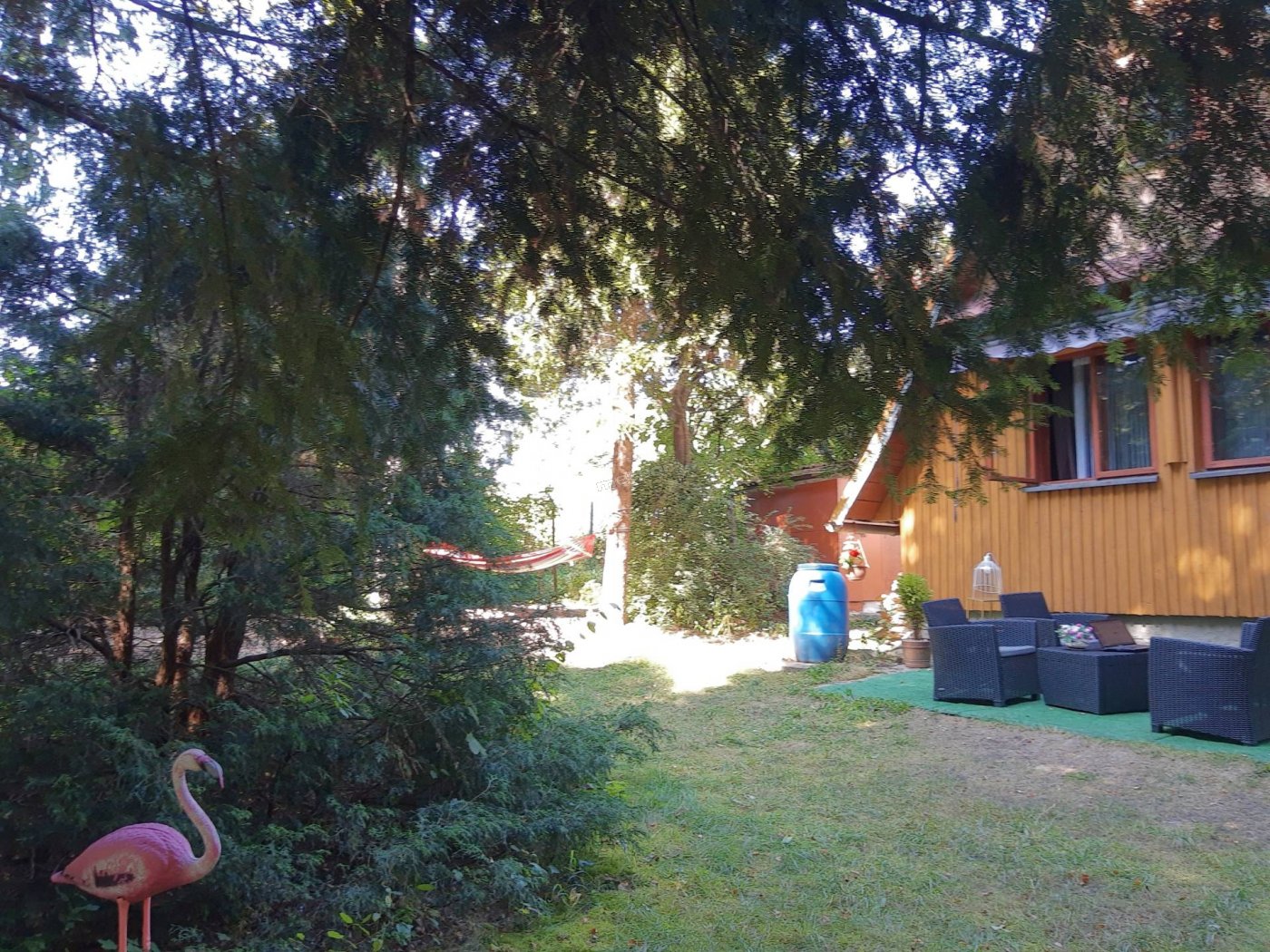 На огороженном участке есть шезлонги, шезлонги, гамак, переносной гриль и место для парковки.