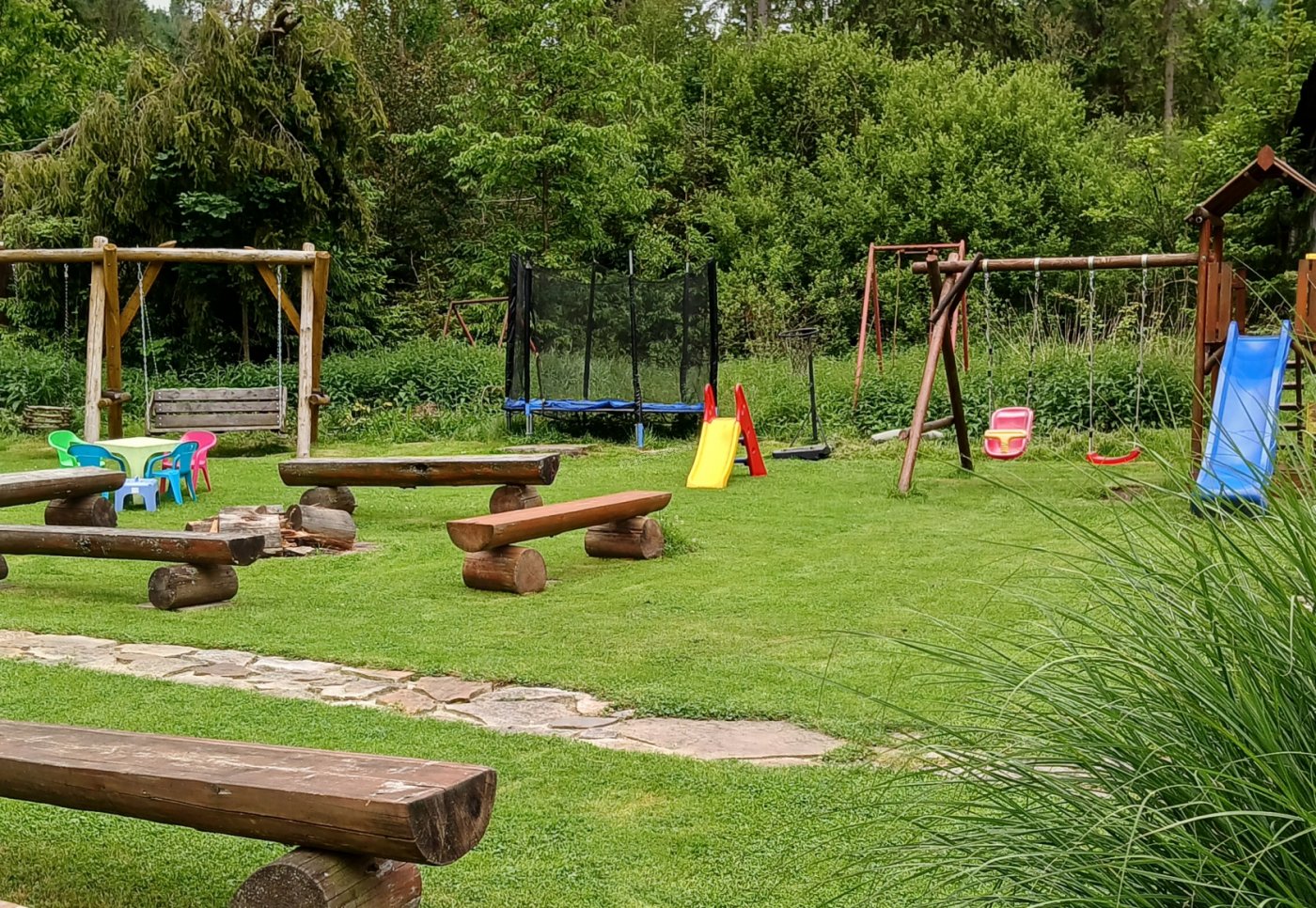 Для детей детская площадка, горка, песочница, качели, батут, ракетки для бадминтона, футбол, мобильные ворота, более 500 м2 сада.