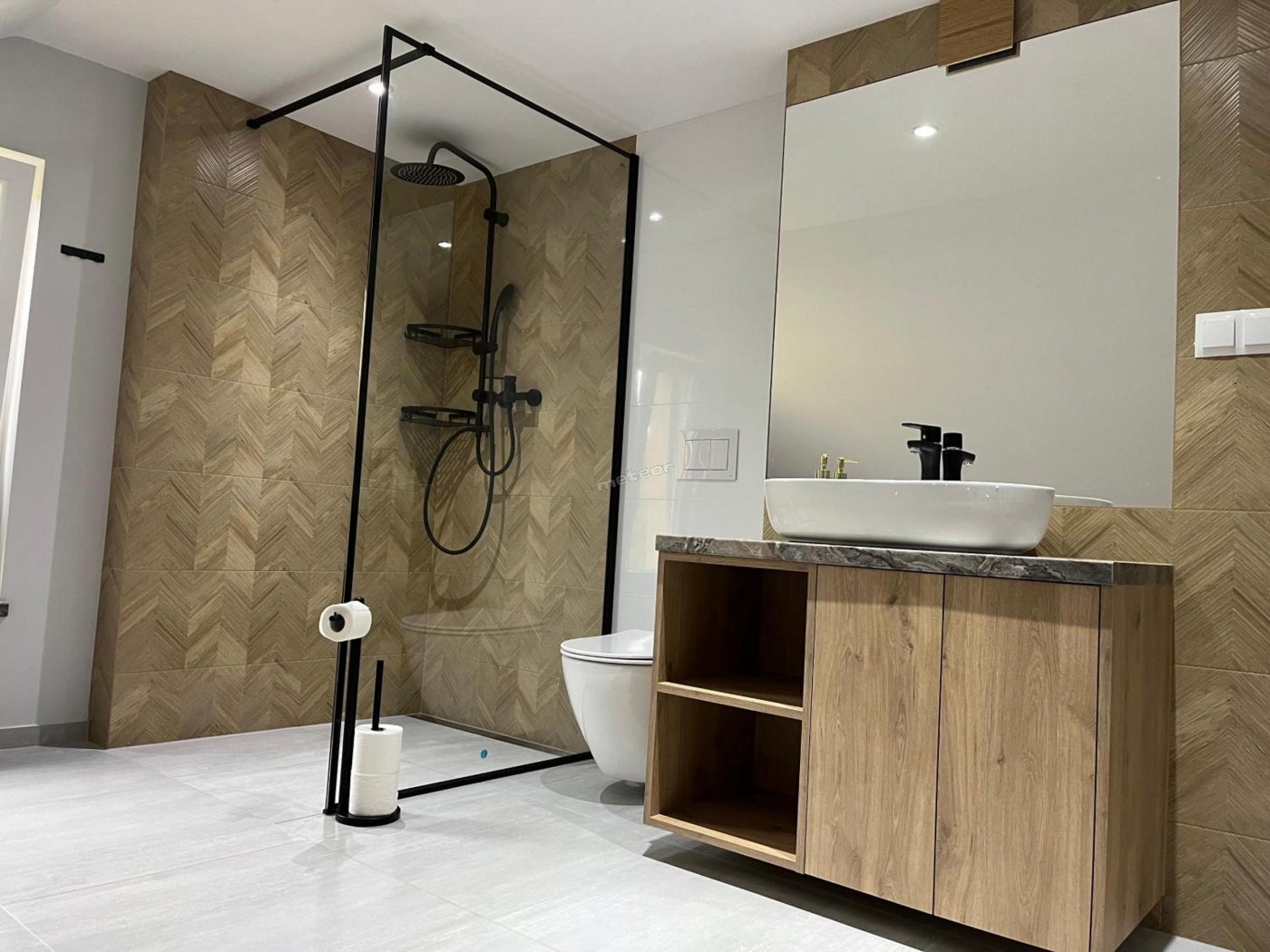 Klimatyzowany apartament o powierzchni 80 m2 z sypialnią, salonem, kuchnią, 2 łazienkami i tarasem.