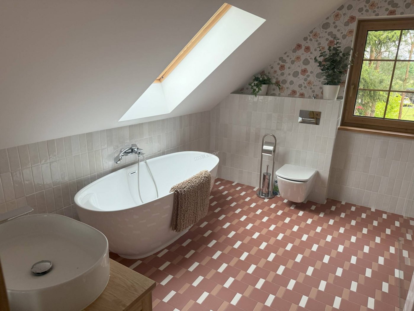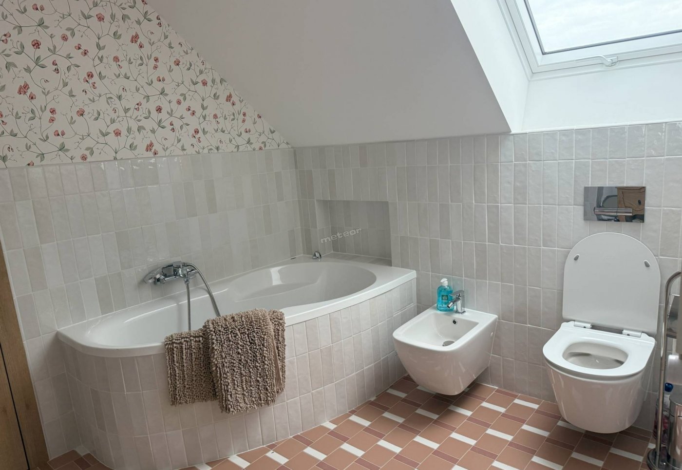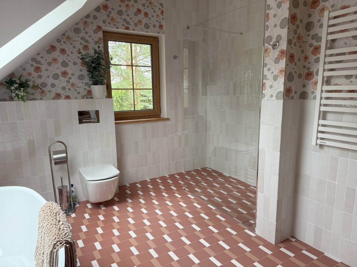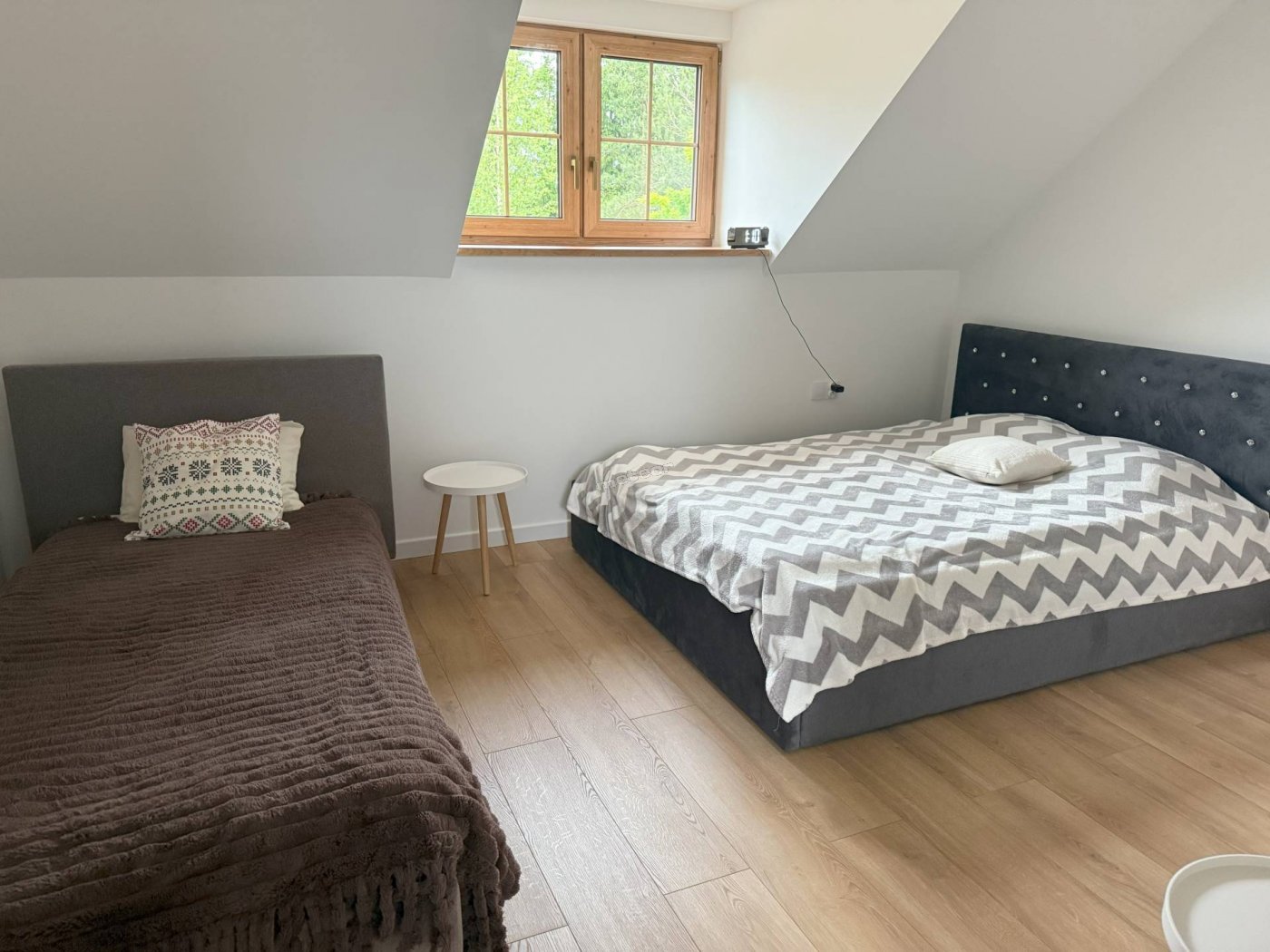 Na piętrze domu: sypialnia z łóżkiem 180x200 i rozkładaną kanapą, sypialnia 2-osobowa z dwoma pojedynczymi łóżkami z możliwością ich połączenia, sypialnia z dwoma łóżkami 160x200 i 100x200 z własną łazienką (wyposażenie łazienki: wanna i prysznic). Na piętrze jest również do dyspozycji jeszcze jedna łazienka z wanną i prysznicem.