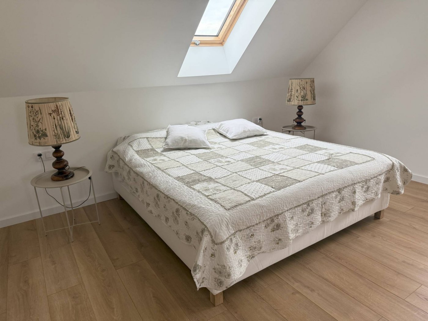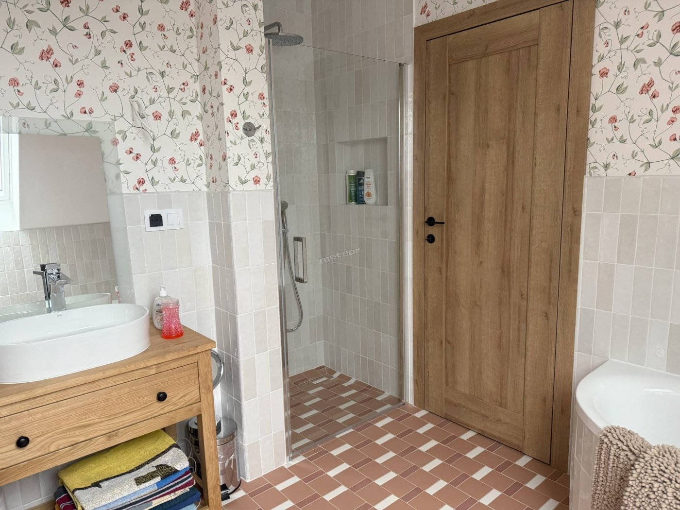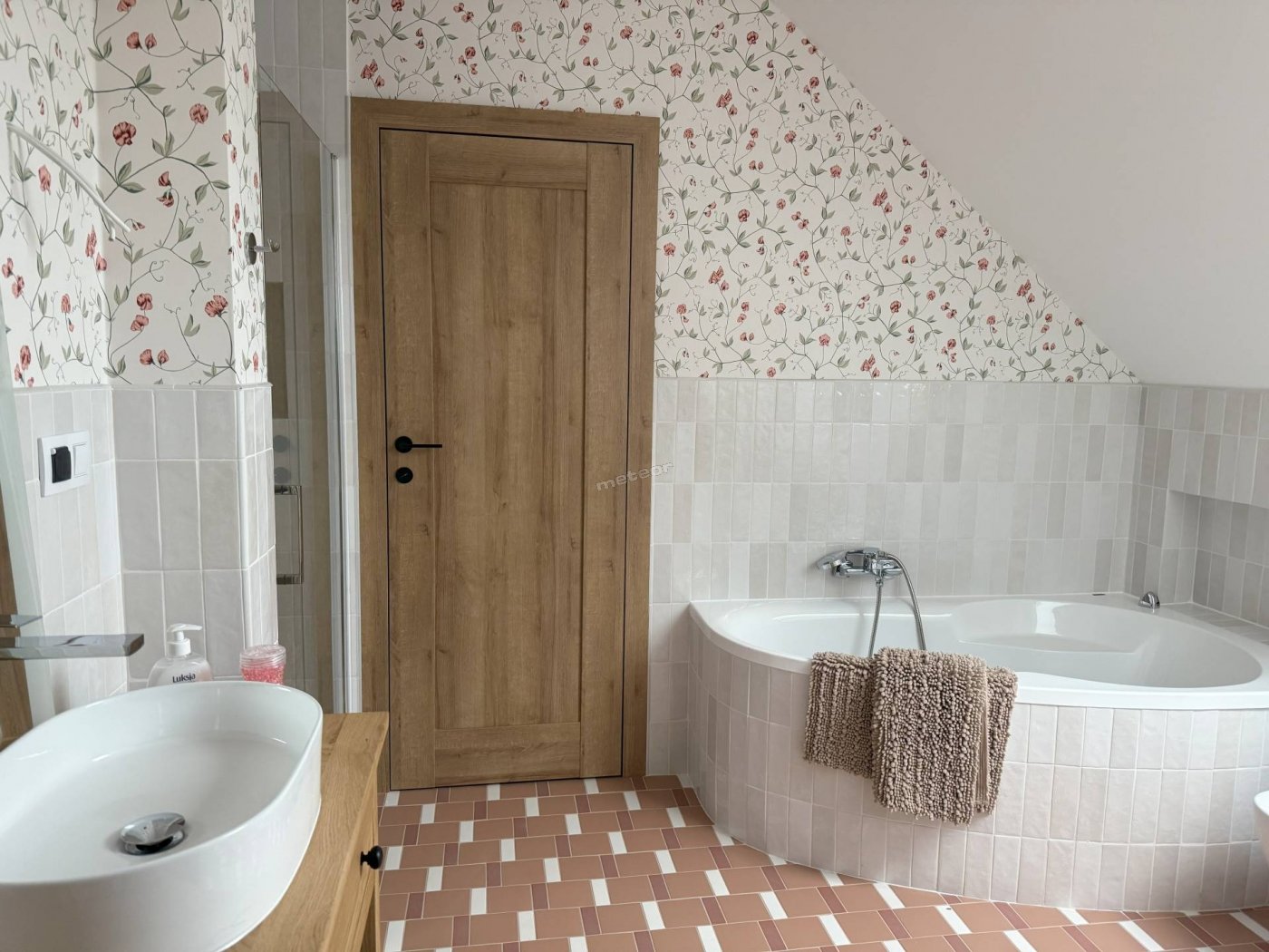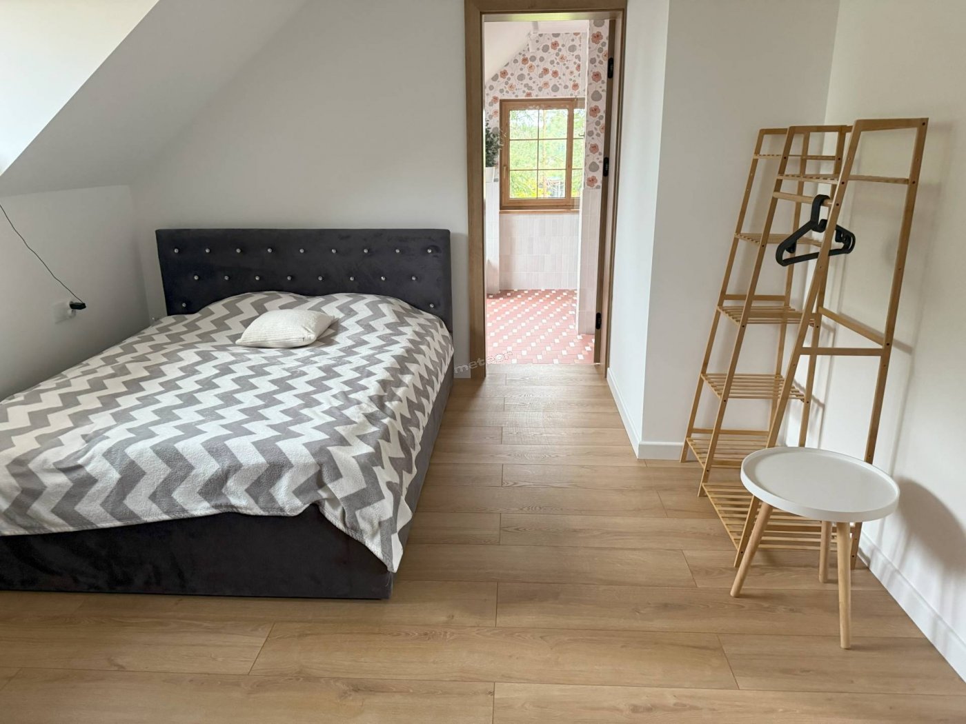 Na piętrze domu: sypialnia z łóżkiem 180x200 i rozkładaną kanapą, sypialnia 2-osobowa z dwoma pojedynczymi łóżkami z możliwością ich połączenia, sypialnia z dwoma łóżkami 160x200 i 100x200 z własną łazienką (wyposażenie łazienki: wanna i prysznic). Na piętrze jest również do dyspozycji jeszcze jedna łazienka z wanną i prysznicem.