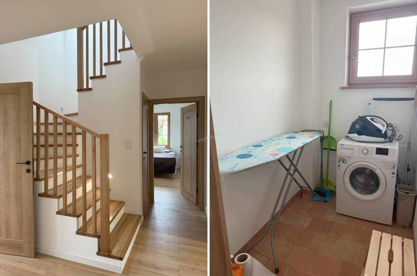 Z salonu jest bezpośrednie wyjście na piękny taras. Na parterze jest również jedna sypialnia z łóżkiem 180x200, łazienka z prysznicem oraz pralnia z kącikiem do prasowania.
