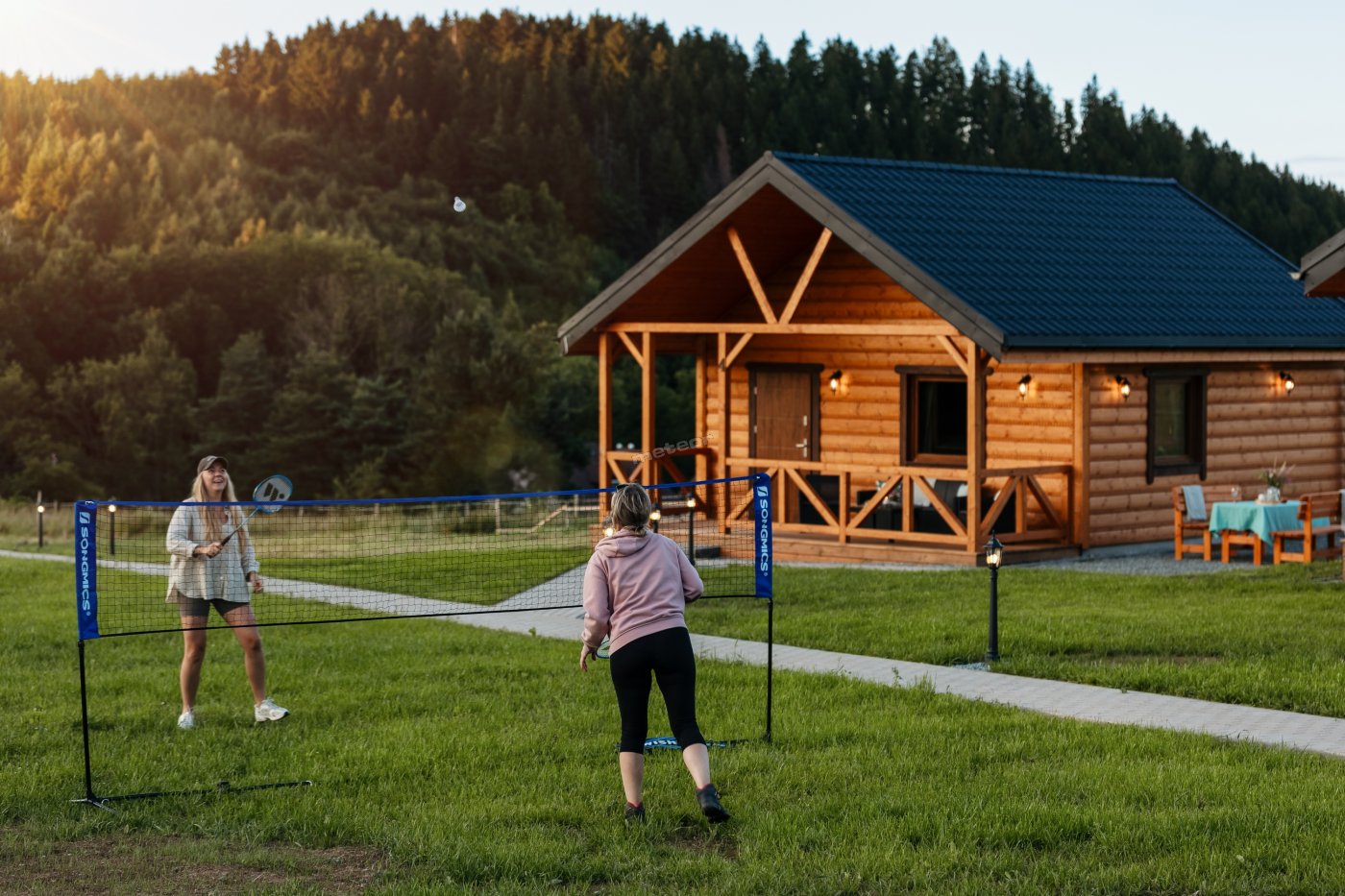 Zacznij dzień od filiżanki kawy siedząc wygodnie na tarasie, czując na twarzy chłodną mgłę unoszącą się nad łąką. Czasem, tuż przy domkach, pojawi się sarna – spokojna i cicha, jakby należała do tego miejsca bardziej niż my sami. Wieczorem zanurz się w ciemności, którą rozświetla jedynie księżyc i tysiące gwiazd – niebo nad Sudecką Przystanią potrafi naprawdę zachwycić swoją głębią i czystością. A może skusi Cię lot balonem? Start możliwy jest bezpośrednio z terenu ośrodka – to niezapomniana przygoda i widoki, które na długo zostają w sercu.