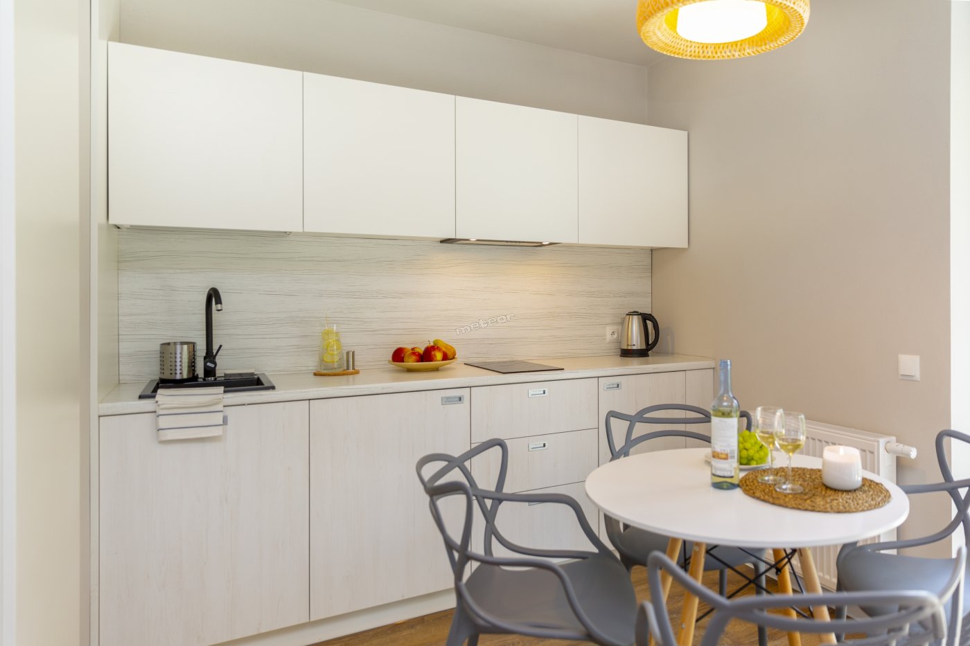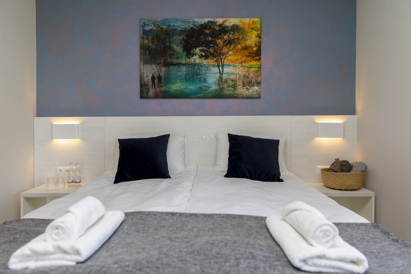 Apartamenty 2-osobowe. Na apartament składa się: pokój, aneks kuchenny, łazienka. Niektóre z balkonem lub tarasem.